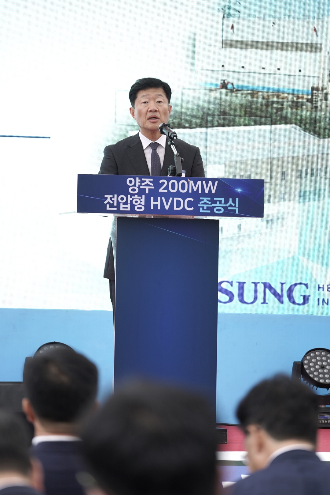 효성중공업과 한국전력공사는 7월 9일 경기도 양주변전소에서 200MW 규모의 전압형 HVDC변환설비 구축을 기념하는 준공식을 개최했습니다. 이날 준공식에는 우태희 효성중공업 대표, 이호현 산업통상자원부 에너지정책실장, 김석주 한국전기연구원 부원장, 서철수 한국전력공사 전력계통본부장을 비롯한 관계자 100여명이 참석했습니다.