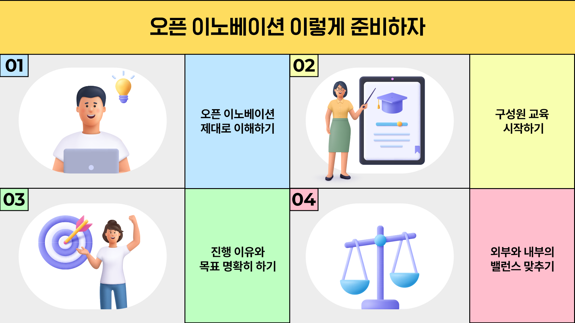 새로운 비전을 향한 오픈 이노베이션의 준비 전략부터 성공 전략까지 알아봤습니다. 무엇보다 가장 중요한 것은 오픈 이노베이션을 진행하는 이유와 목표를 명확하게 설정하여 나아가는 것이 아닐까 생각이 드는데요!
