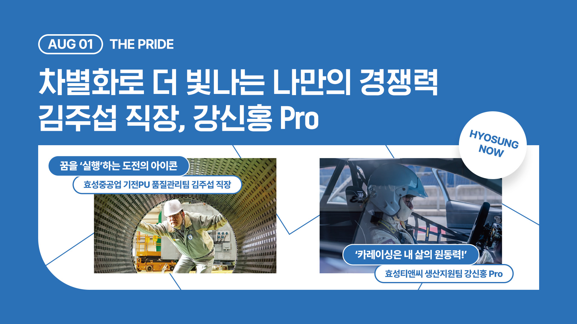 “꿈을 실행하는 도전의 아이콘” 효성중공업 기전PU 품질관리팀 김주섭 직장 그리고 “카레이싱은 내 삶의 원동력!” 효성티앤씨 생산지원팀 강신홍 Pro. 직무 이야기를 넘어 효성인들의 성장 이야기와 조금은 특별한 취미 이야기까지 들어봤습니다😊 그들의 차별화된 인생 스토리 지금 바로 시작합니다✨