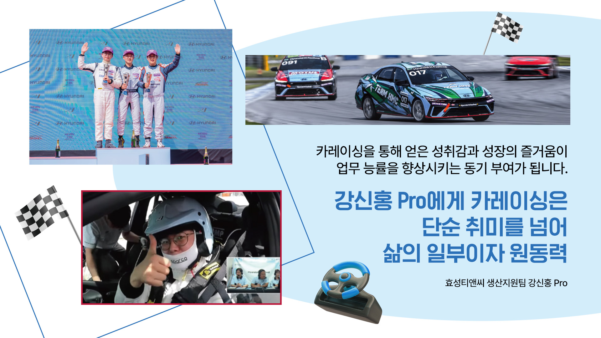 “카레이싱을 통해 얻은 성취감과 성장의 즐거움이 업무 능률을 향상시키는 동기 부여가 되고 있습니다.”