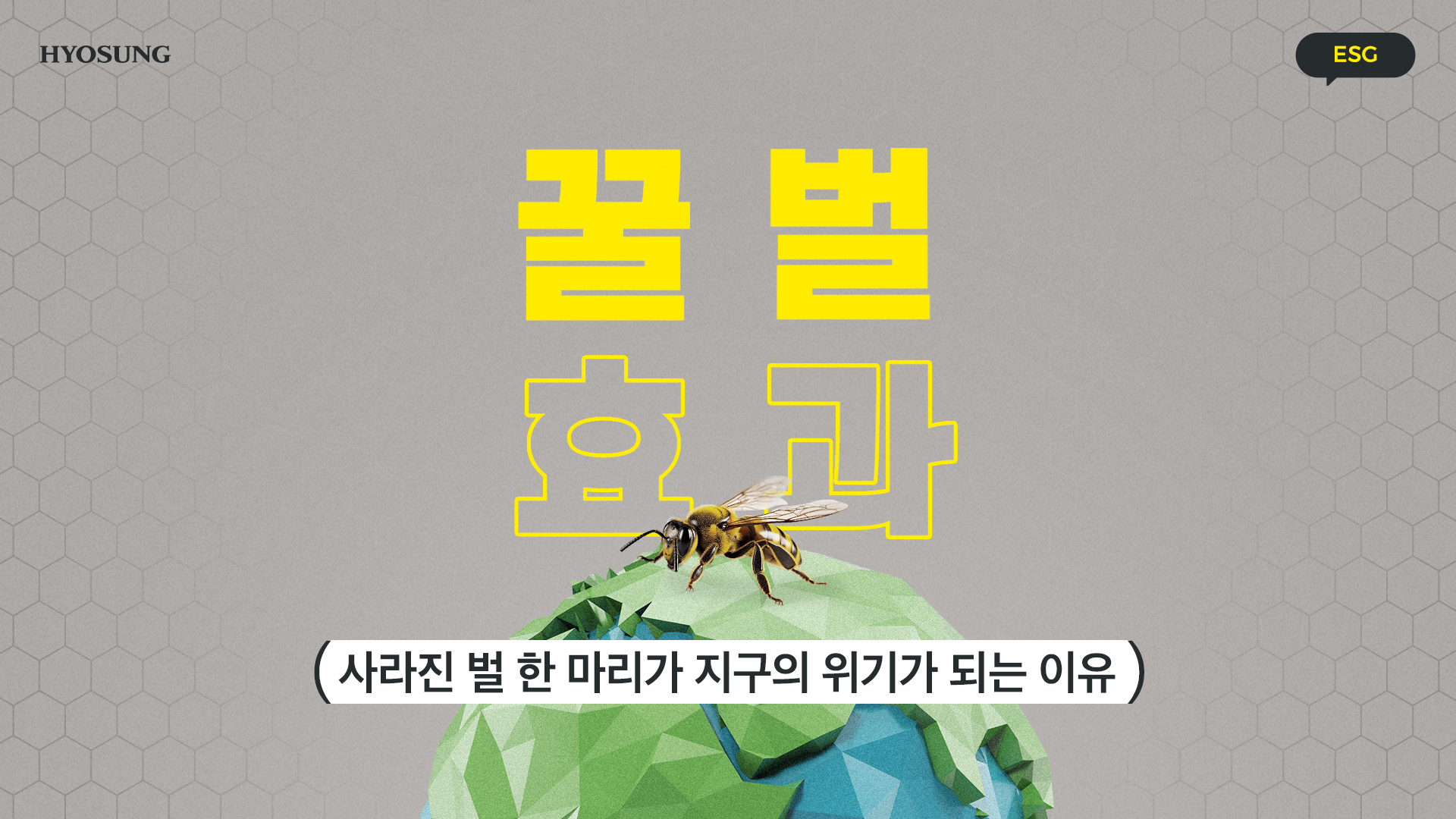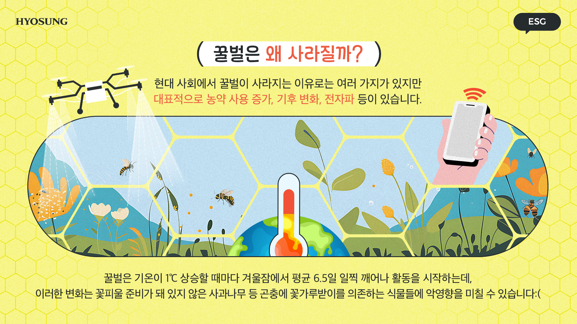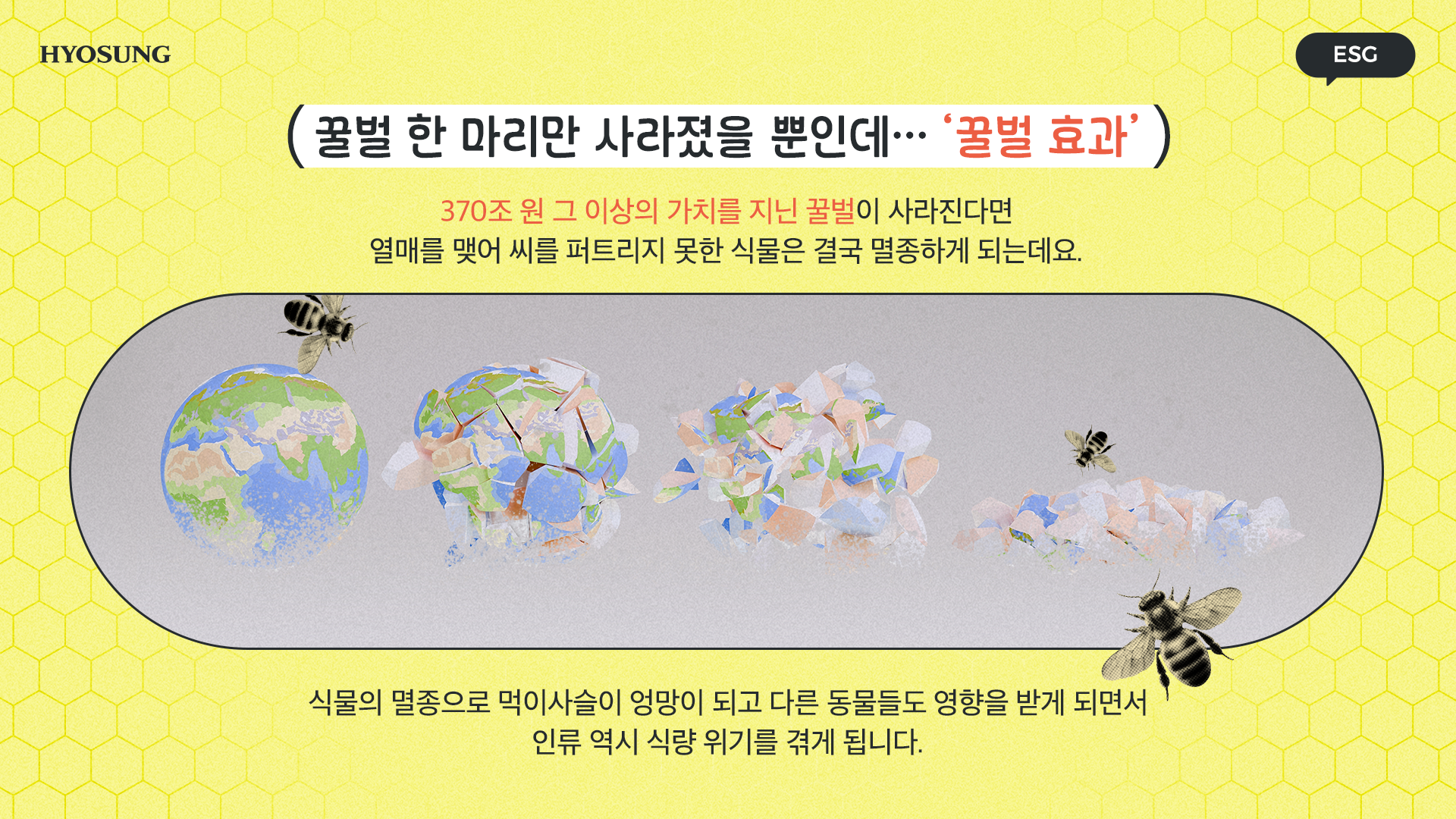 ‘꿀벌의 멸종’, ‘지구의 위협’ 이를 해결하기 위한 ‘효성의 노력’까지 살펴봤는데요. 꿀벌 한 마리가 사라지면 지구에 어떤 큰 재앙이 일어나는지 알 수 있었습니다.