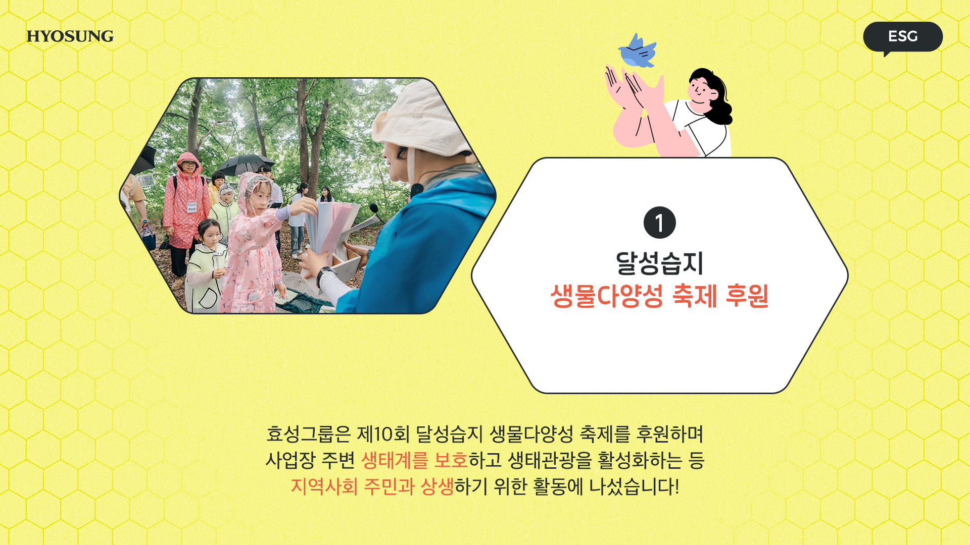 생물다양성 보존의 중요성이 커지면서, 효성도 생물다양성보존활동에 적극 참여하고 있습니다. 관련해 효성의 ESG 활동을 보여드릴게요!