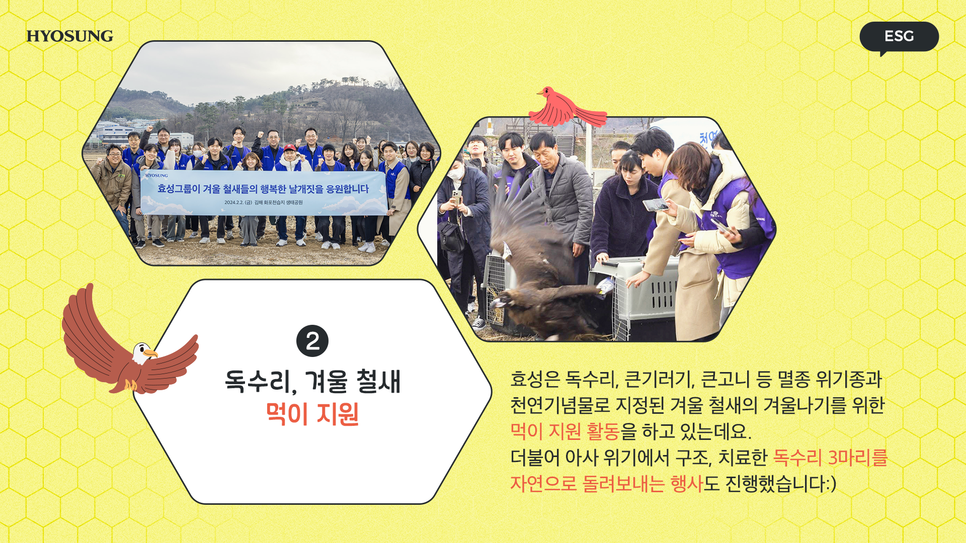 효성은 독수리, 큰기러기, 큰고니 등 멸종 위기종과 천연기념물로 지정된 겨울철새의 겨울나기를 위한 먹이 지원 활동을 하고 있는데요. 올 2월에는 아사 위기에서 구조, 치료한 독수리 3마리를 자연으로 돌려보내는 행사를 진행했어요. 독수리 3마리에 ‘효성 1호, 효성 2호, 효성 3호’라는 이름을 짓기도 했습니다.