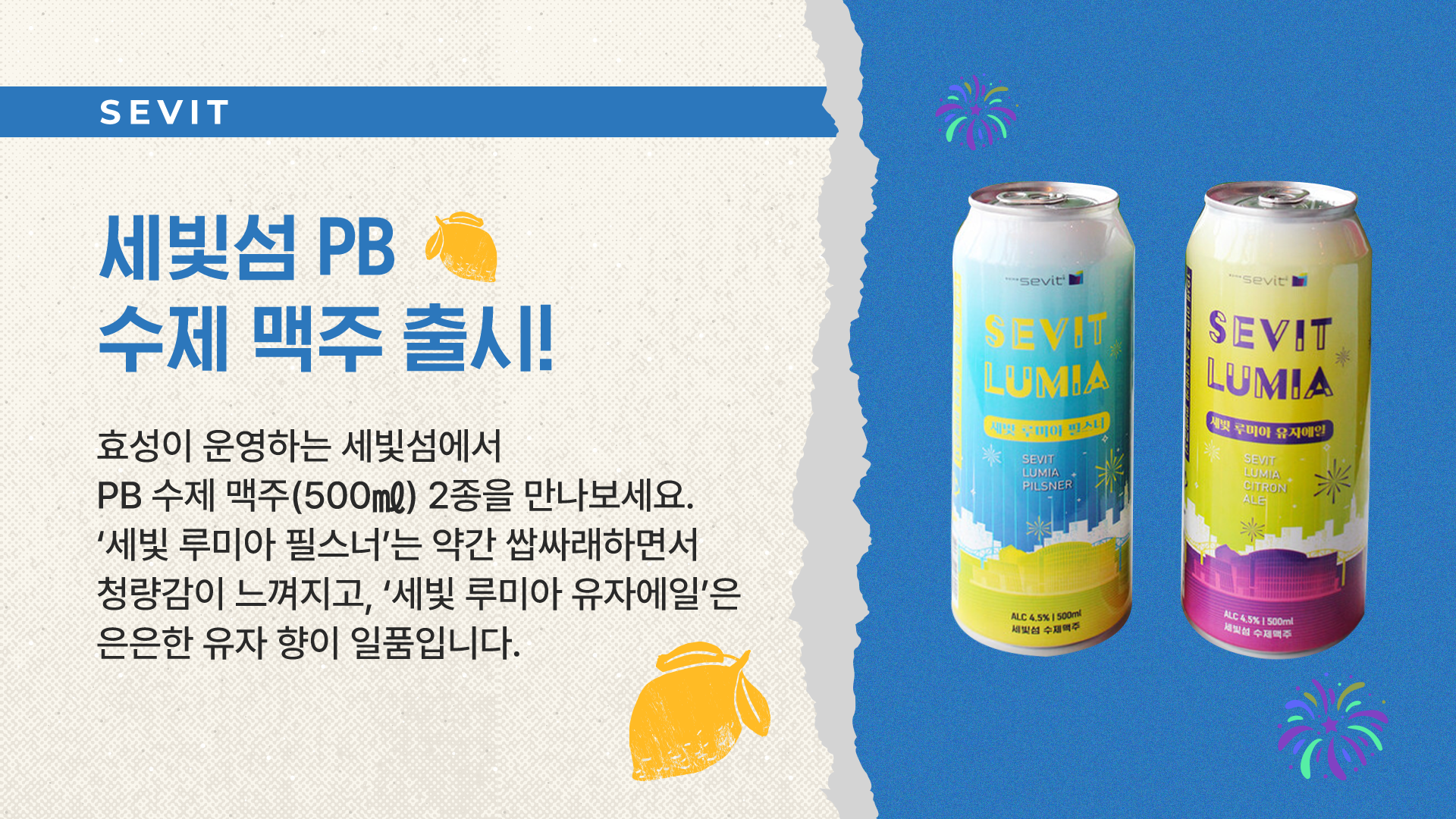 더불어 세빛섬 PB 수제 맥주가 출시됐습니다! 효성이 운영하는 세빛섬에서 PB 수제 맥주(500㎖) 2종을 만나보세요. ‘세빛 루미아 필스너’는 약간 쌉싸래하면서 청량감이 느껴지고, ‘세빛 루미아 유자에일’은 은은한 유자 향이 일품입니다.