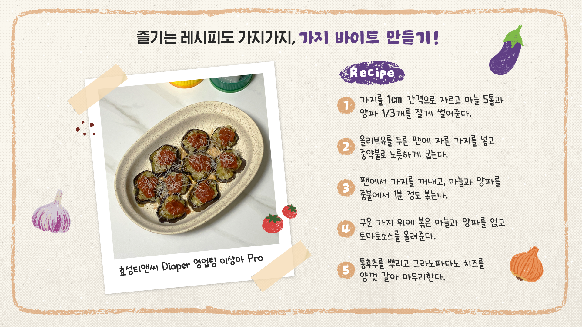 맥주 안주가 필요할 때 저의 선택은 가지 바이트! 요리에 재능과 흥미가 없는 사람도 손쉽게 만들 수 있고 재료도 쉽게 구할 수 있는 것들이죠. 무엇보다 간단한 재료로 고급스럽고 이국적인 맛을 낼 수 있다는 게 가장 큰 매력이랍니다.”