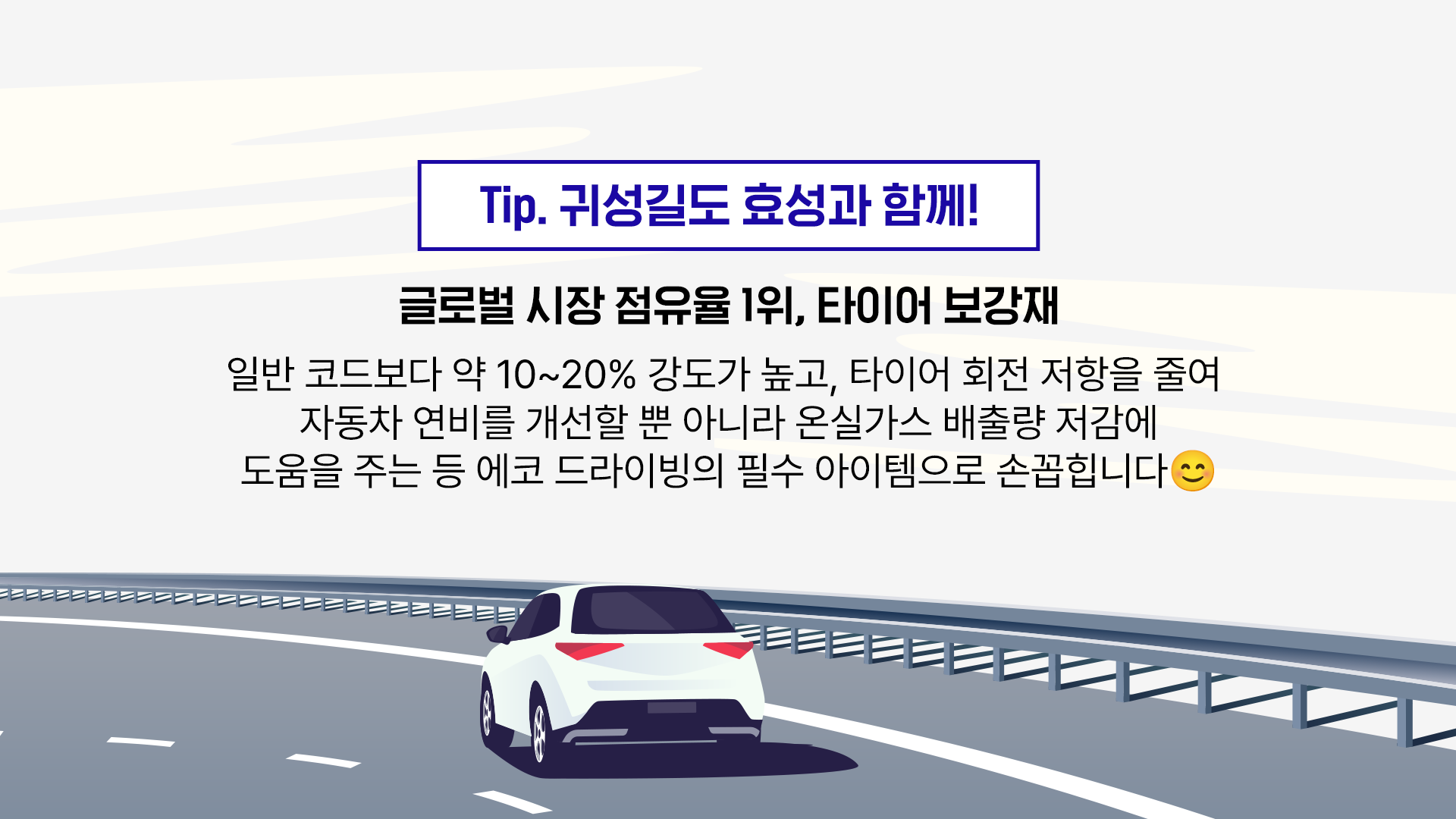 HS효성첨단소재가 만드는 고강도 섬유 타이어코드는 타이어의 형태를 잡아주고 타이어 성능에 따라 영향을 주는 보강재인데요. 일반 코드보다 약 10~20% 강도가 높고, 타이어 회전 저항을 줄여 자동차 연비를 개선할 뿐 아니라 온실가스 배출량 저감에 도움을 주는 등 에코 드라이빙의 필수 아이템으로 손꼽힙니다😊