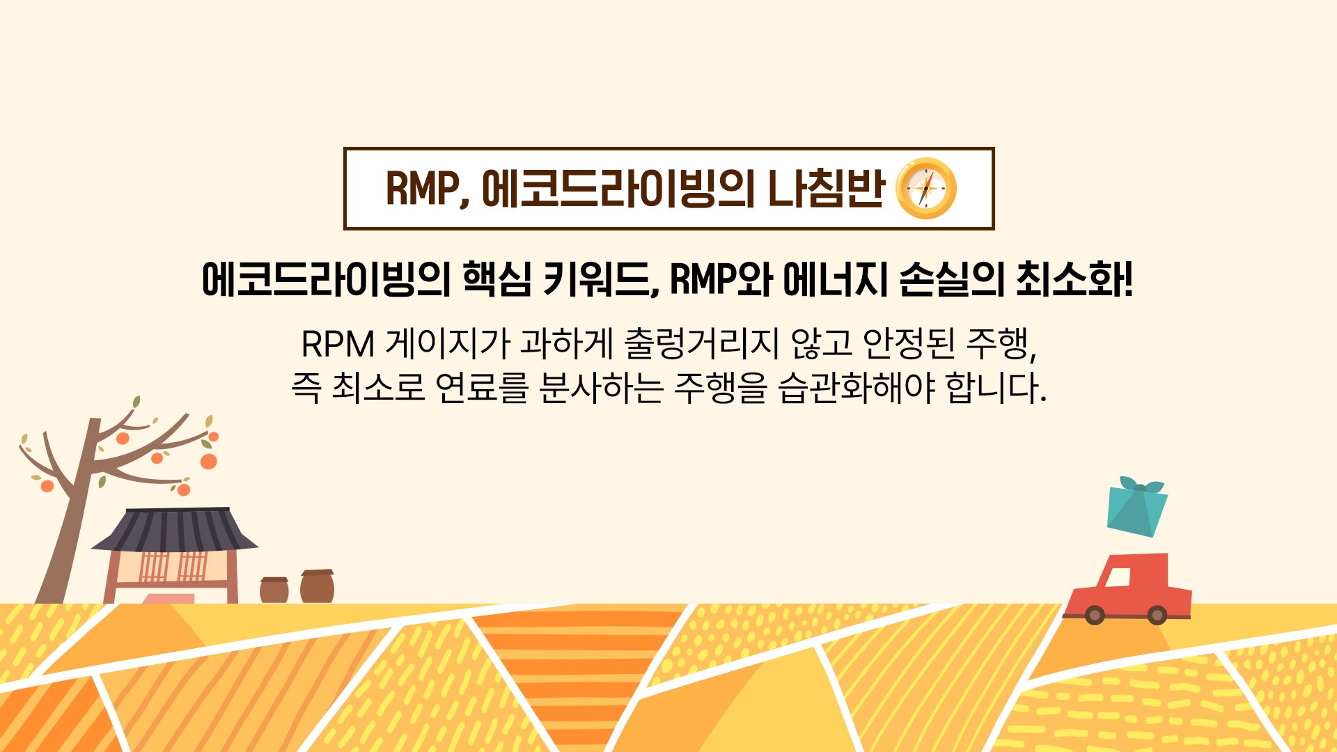 RPM 게이지는 차량을 급하게 출발하거나 정지하면 급격히 올라가는데요. 물론 가속페달과 브레이크를 깊이 밟으면 원하는 속도에 빨리 도달할 순 있겠지만 연비를 떨어뜨리고 브레이크에 무리를 주게 됩니다. 또한 앞차와의 안전거리 확보도 쉽지 않아요. 따라서 RPM 게이지가 과하게 출렁거리지 않고 안정된 주행, 즉 최소로 연료를 분사하는 주행을 습관화해야 합니다.