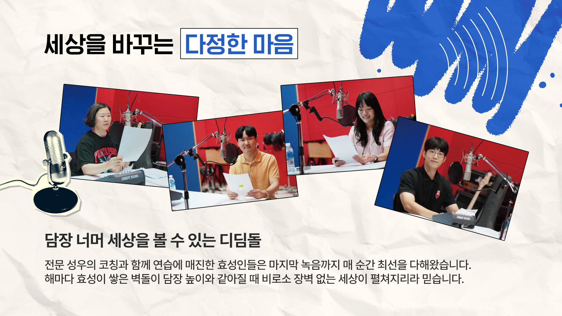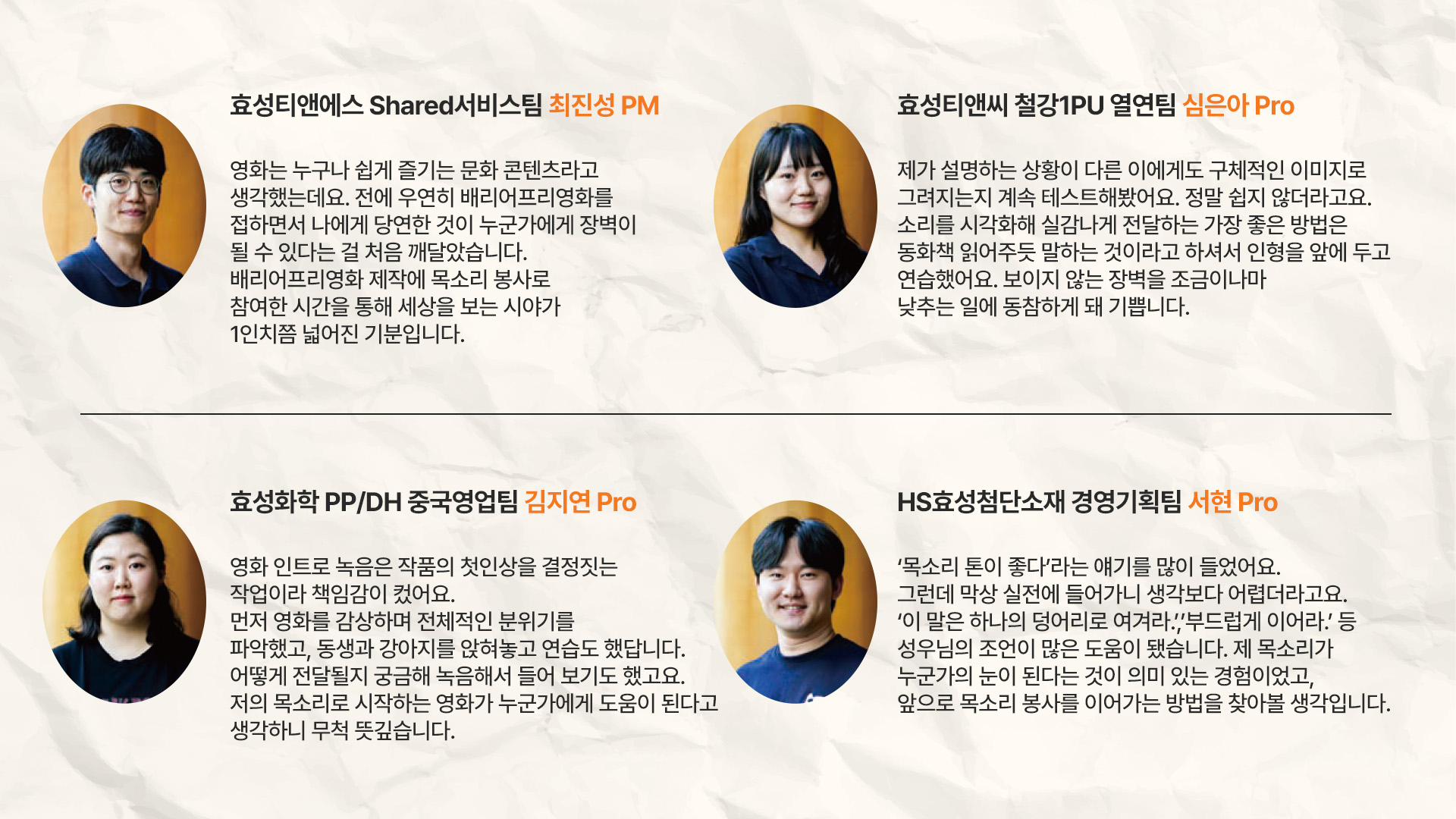 전문 성우의 코칭과 함께 연습에 매진한 효성인들은 마지막 녹음까지 매 순간 최선을 다해왔습니다. 효성화학 김지연 Pro는 "시각장애인을 위한 도서 녹음 봉사를 하고 싶었으나 그간 여러 사정으로 실행하지 못해 아쉬웠다"며 "오랜 염원이던 목소리 봉사에 참여할 수 있어서 뜻깊었다"고 전했습니다. 듣기 편하고 설득력 있는 목소리를 가진 HS효성첨단소재 서현 Pro 역시 자신의 목소리로 장벽 없는 세상을 만드는 데 기여하고 싶었다고 했으며, 효성티앤씨 심은아 Pro는 신입사원 교육 때부터 효성이 배리어프리영화 제작을 지원한다는 사실을 알고 자원봉사자 모집을 기다렸다고 합니다. 효성티앤에스 최진성 PM은 "두 아이에게 매일 밤 동화책을 읽어주며 쌓은 내공에 <전국노래자랑> 인기상 수상의 끼를 더해 실감 나는 녹음을 하겠다"고 포부를 밝히기도 했습니다. 오늘 효성인이 담장 아래 쌓은 작은 벽돌 한 장은 누군가에게 담장 너머 세상을 볼 수 있는 디딤돌이 될 것입니다. 해마다 효성이 쌓은 벽돌이 담장 높이와 같아질 때 비로소 장벽 없는 세상이 펼쳐지리라 믿습니다.