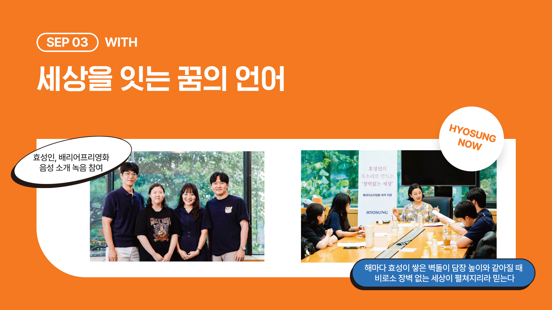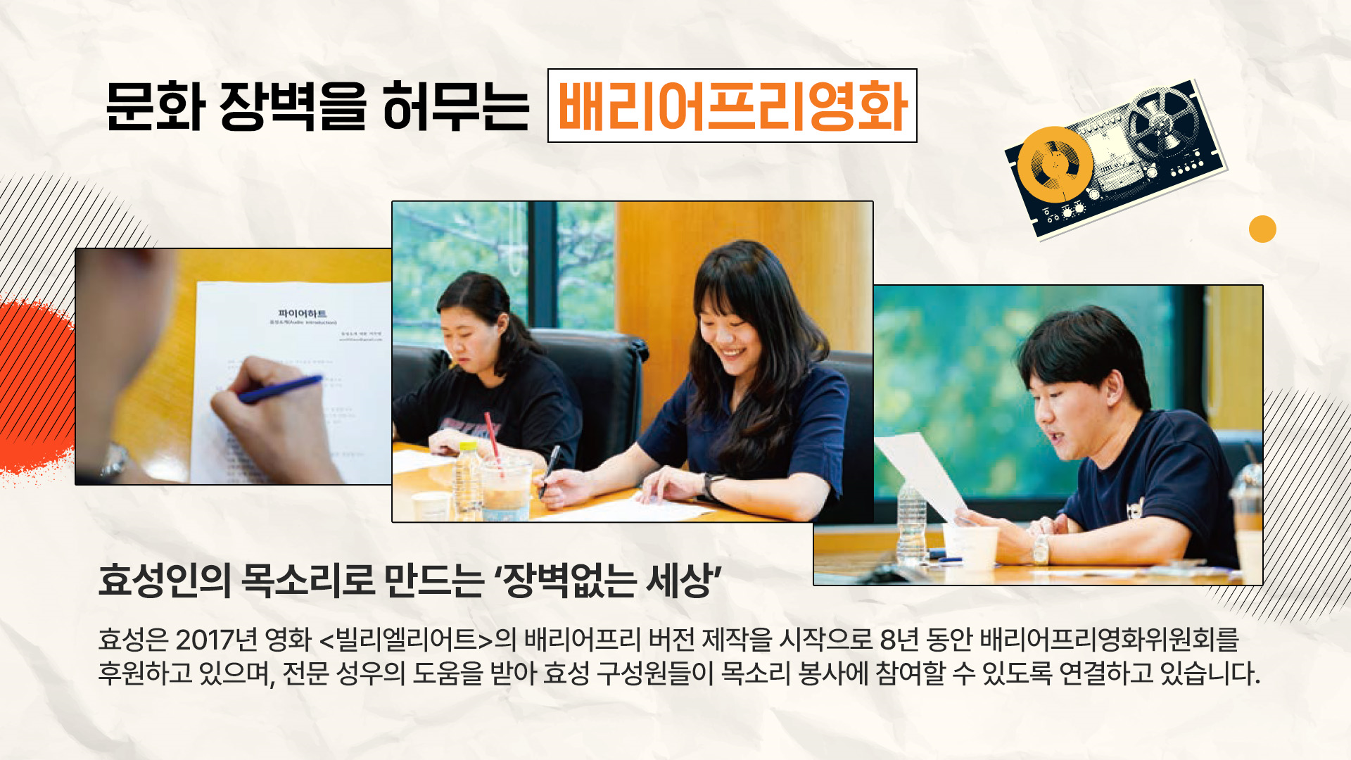 문화 장벽을 허무는 배리어프리영화, 세상을 바꾸는 다정한 마음. 효성은 장벽 없는 세상을 만들기 위해 다양한 활동을 진행하고 있는데요. 효성인의 목소리로 만드는 ‘장벽 없는 세상’의 이야기를 들어보시죠.’