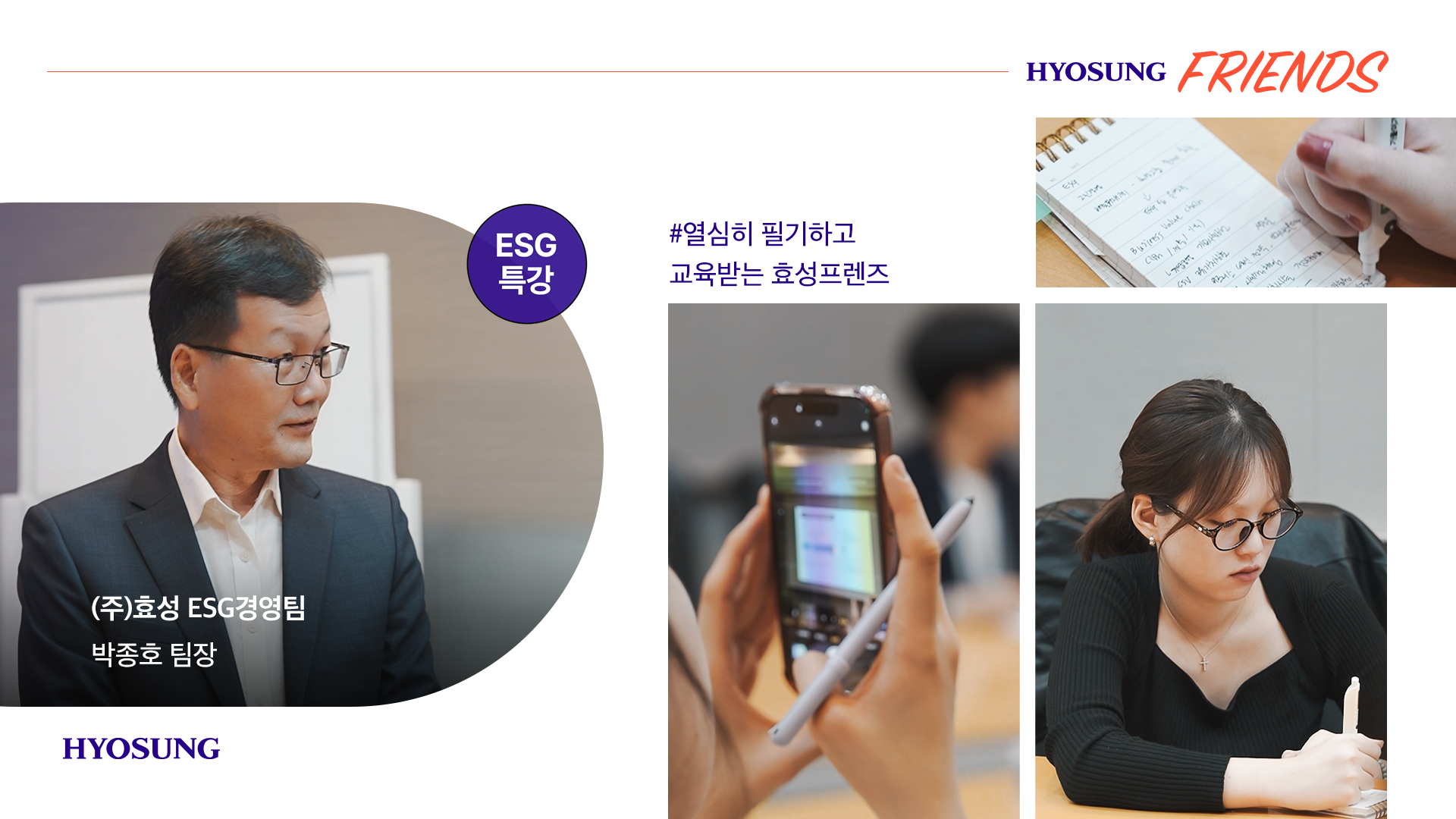 첫 시간은 (주)효성 ESG경영팀 박종호 팀장님이 전해주는 '효성의 지속가능경영 이해' 특강 시간이었습니다. 박종호 팀장님의 핵심 강의와 이를 열심히 필기하고 교육받는 효성프렌즈 4기들로 인해, 현장 분위기는 아주 열정적이었습니다!