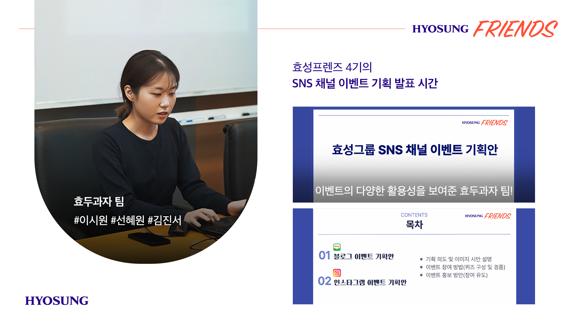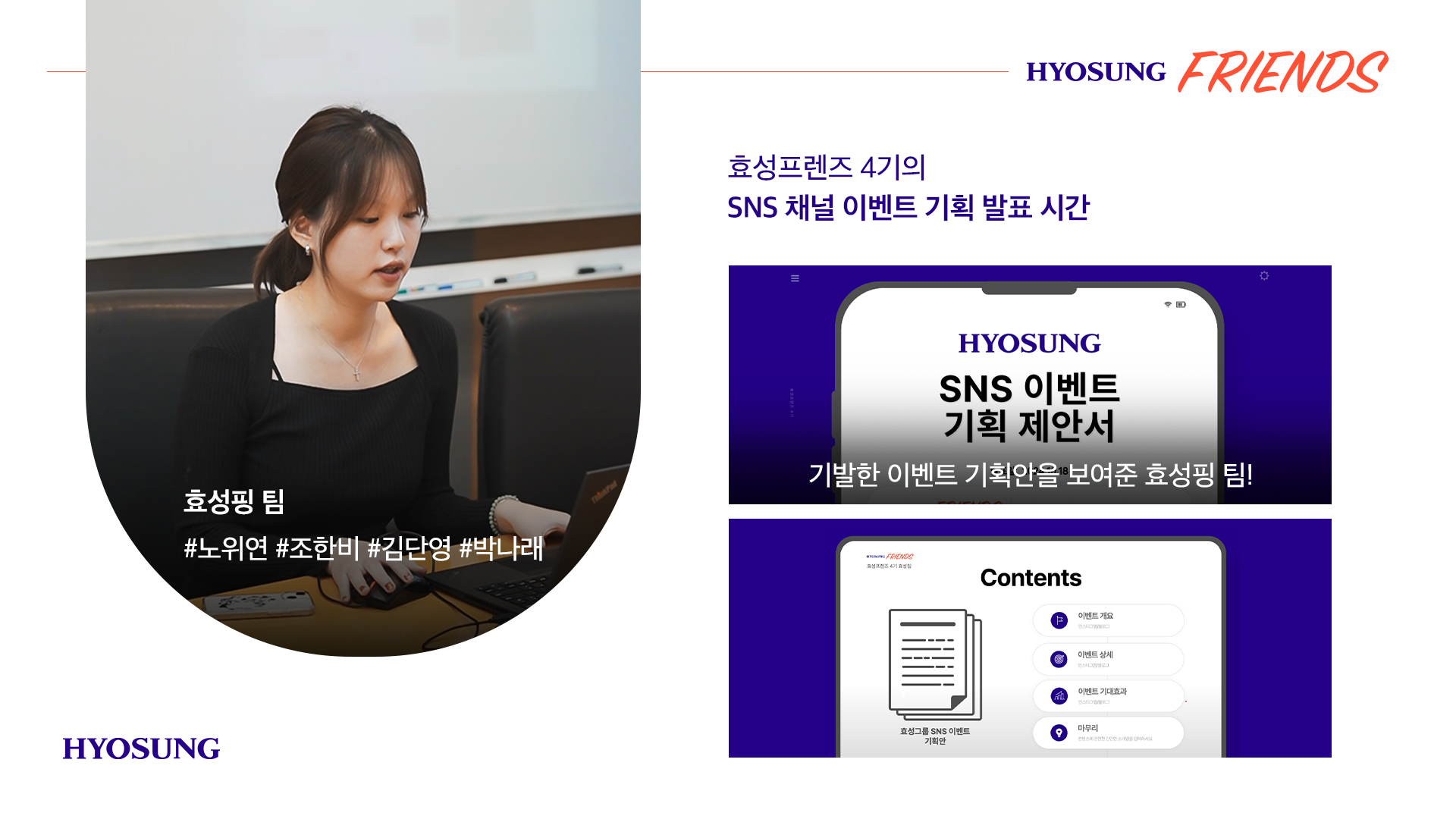 특강이 마무리된 후 효성프렌즈는 10월에 열심히 기획하고 준비했던 'SNS 채널 이벤트 기획 발표 시간'을 가졌는데요! 첫 순서로는 효성핑 팀의 노위연 프렌즈가 발표를 진행했습니다.