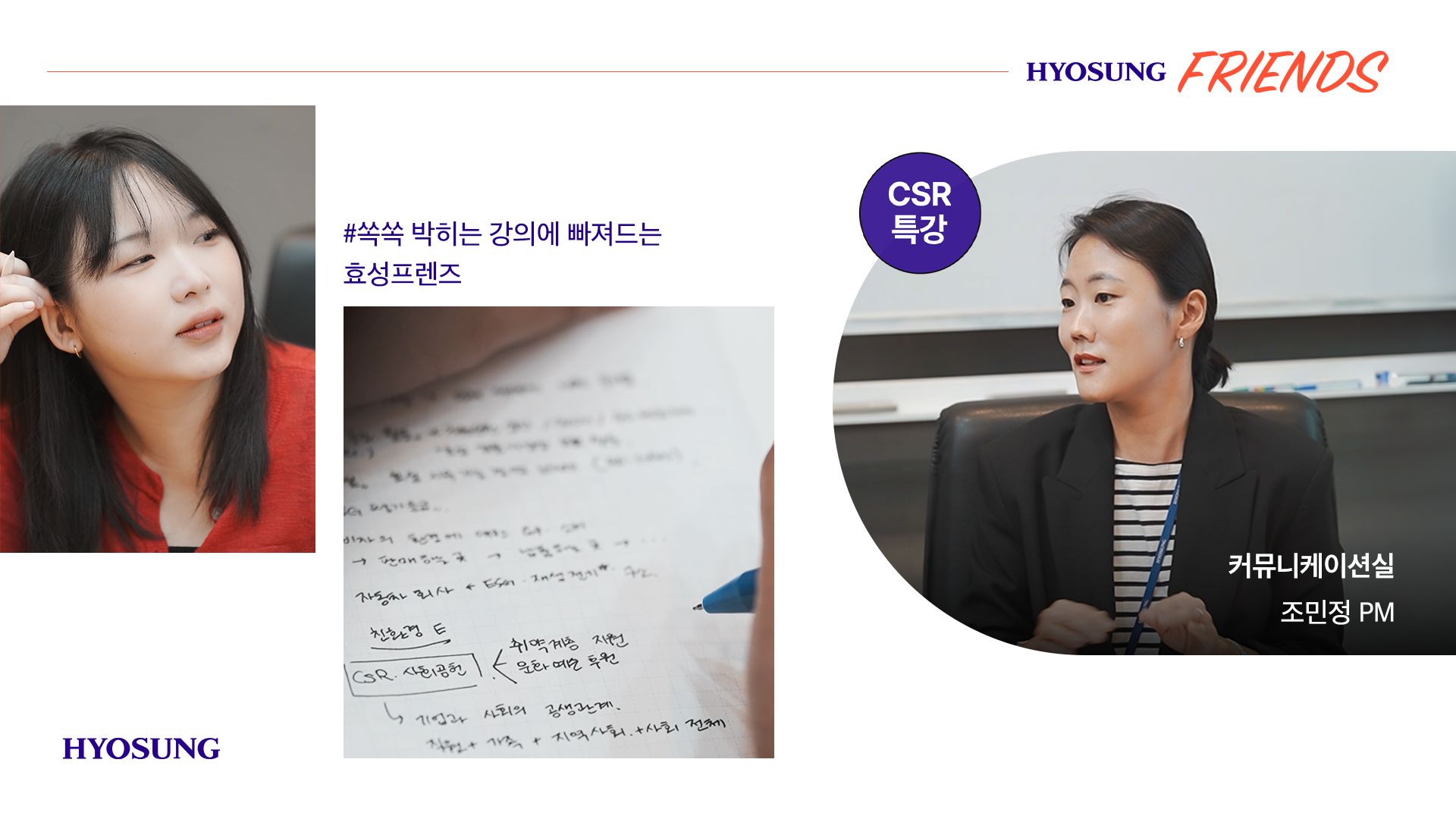 그다음으로는 커뮤니케이션실의 조민정 PM 님이 전해주는 '효성의 CSR' 특강이었습니다. 조민정 PM님은 효성프렌즈 1기 때부터 꾸준히 CSR 특강을 진행해 주셨는데요. 항상 믿고 듣는 조민정 PM님의 '쏙쏙 박히는 강의력' 덕분에 효성프렌즈 4기는 효성의 CSR 활동에 빠져들었답니다:)