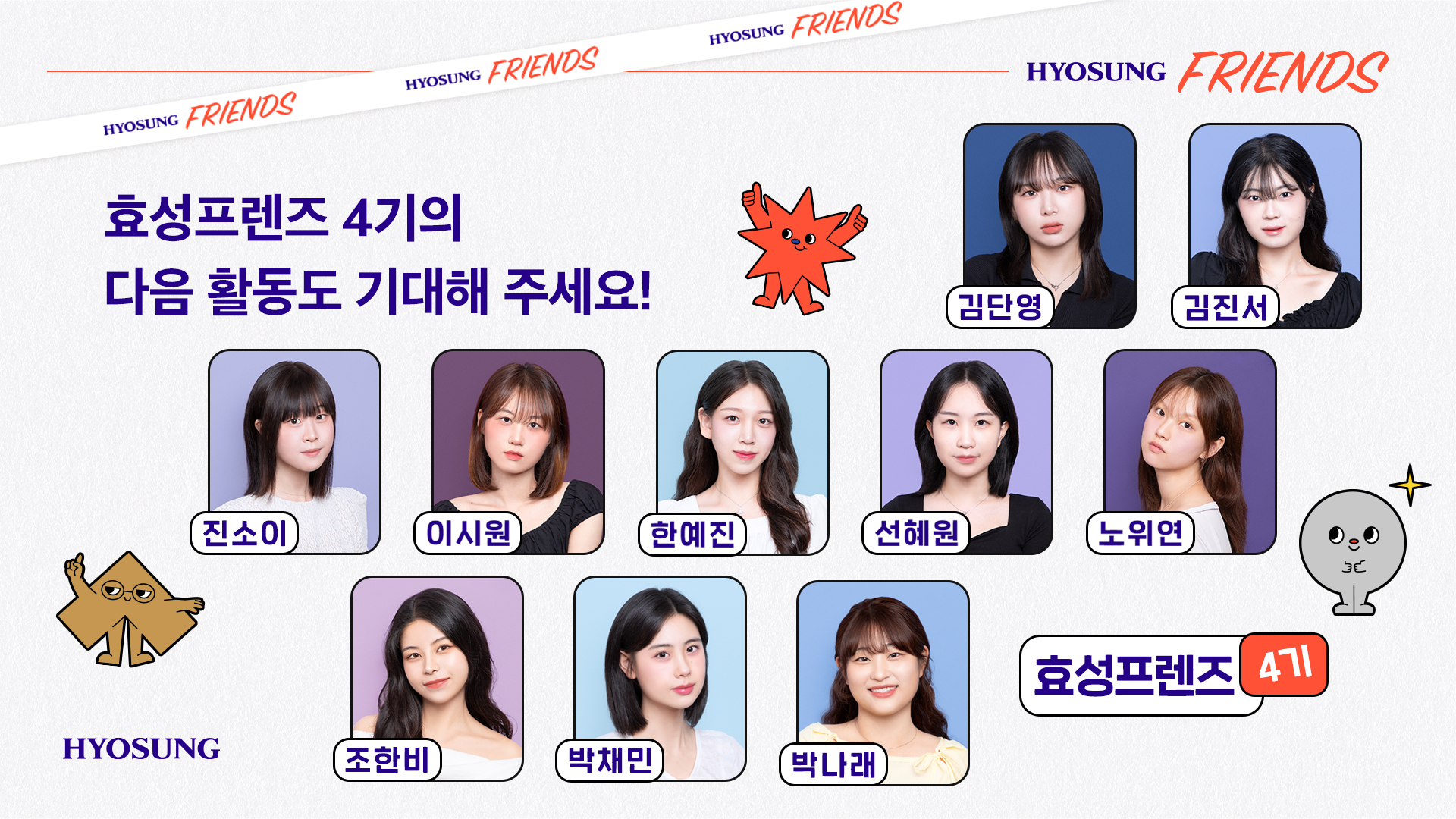 항상 갓생을 살며 지구를 위해 그리고 효성을 위해 양질의 콘텐츠를 제작하는 효성프렌즈의 남은 활동도 너무 기대되는 하루였습니다! 효성프렌즈 4기의 다음 활동도 기대해 주세요:)