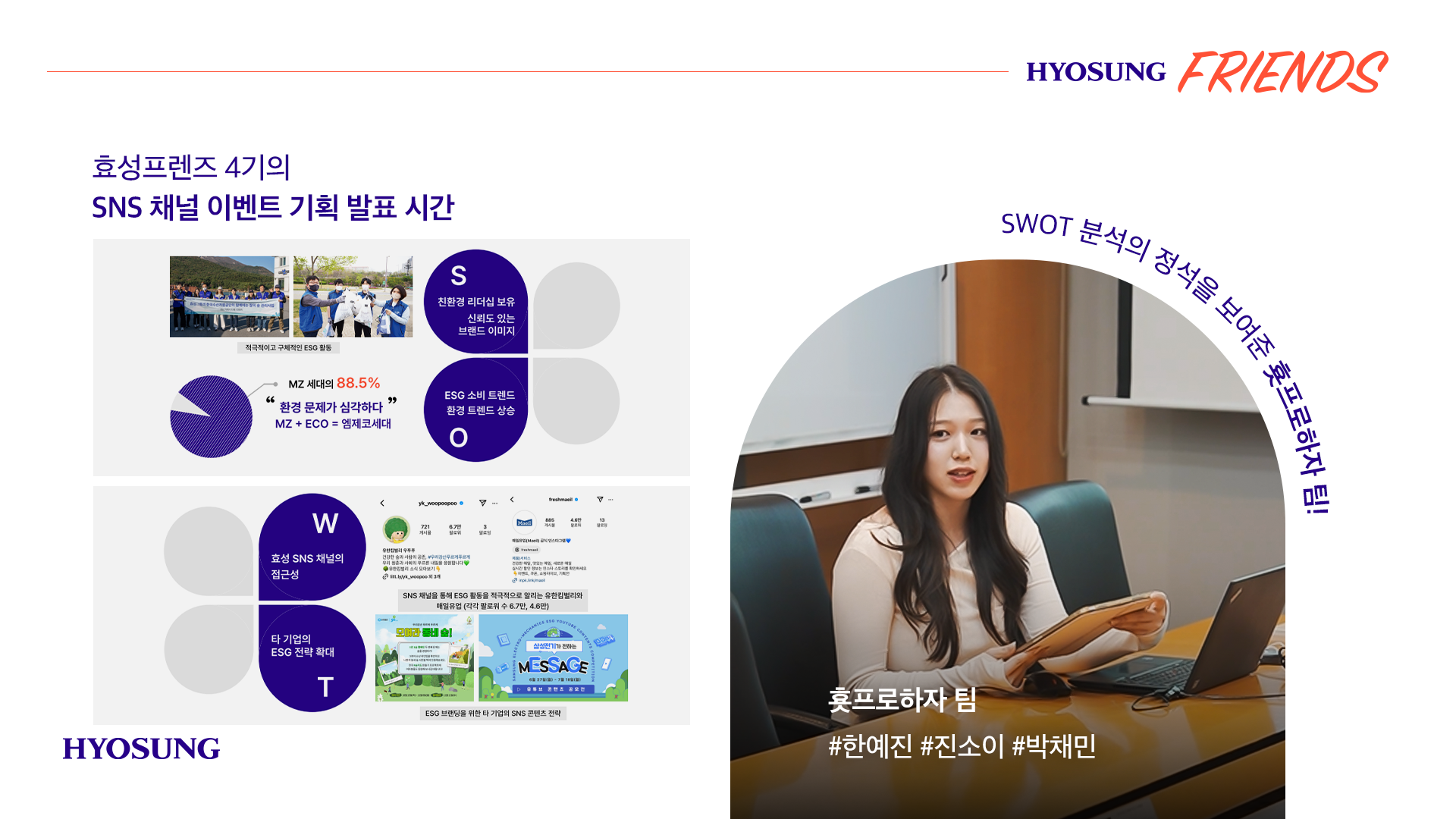 다음 발표자는 횻프로하자 팀의 한예진 프렌즈였습니다:) SWOT 분석을 통해 효성과 경쟁사의 위치를 도출해 낸 데이터로 이벤트를 기획한 횻프로하자 팀! 그만큼 신뢰도도 높은 이벤트를 기획해 좋은 평가를 받았는데요. 더불어 이벤트로 브랜드 이미지 확산에 도움을 준 실제 사례들을 근거로 들어 기획안의 정석을 보여줬답니다!