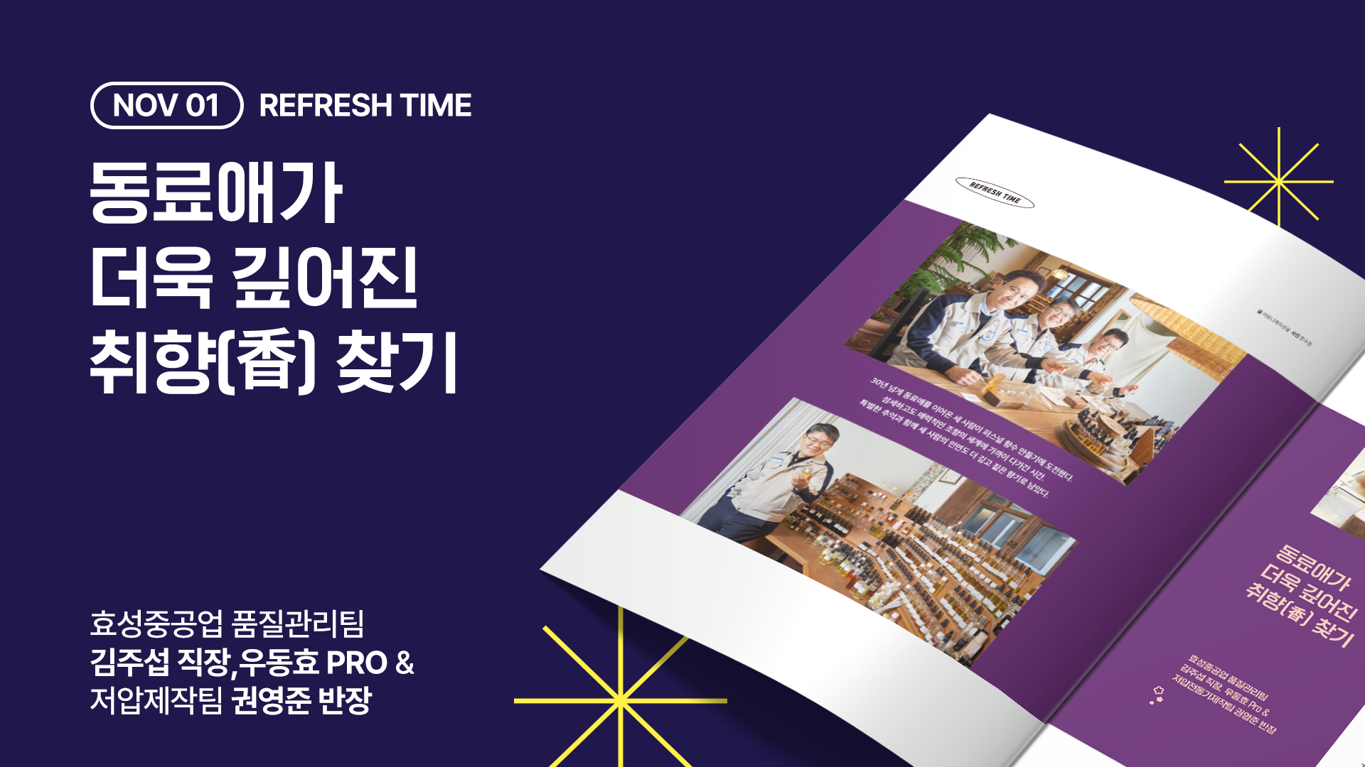 “김주섭 직장님은 시원하고 청량한 아쿠아스파 향이랄까요? 막힘없이 제품을 꿰뚫어보는 것은 물론 문제 발생 시 명쾌하게 솔루션을 내놓거든요. 우동효 Pro님의 경우 오렌지 향과 잘 어울려요. 호불호가 거의 없는 오렌지처럼 주변 사람들이 다 좋아하는 동료이기 때문입니다.” 권영준 반장의 말이 끝나자마자 우동효 Pro가 그를 가리키며 “그린 향!”을 외쳤다. 타 부서나 동료들과 조화를 잘 이루고, 늘 긍정적인 에너지를 발산하는 모습이 초록초록한 필드를 연상케 한다는 것.