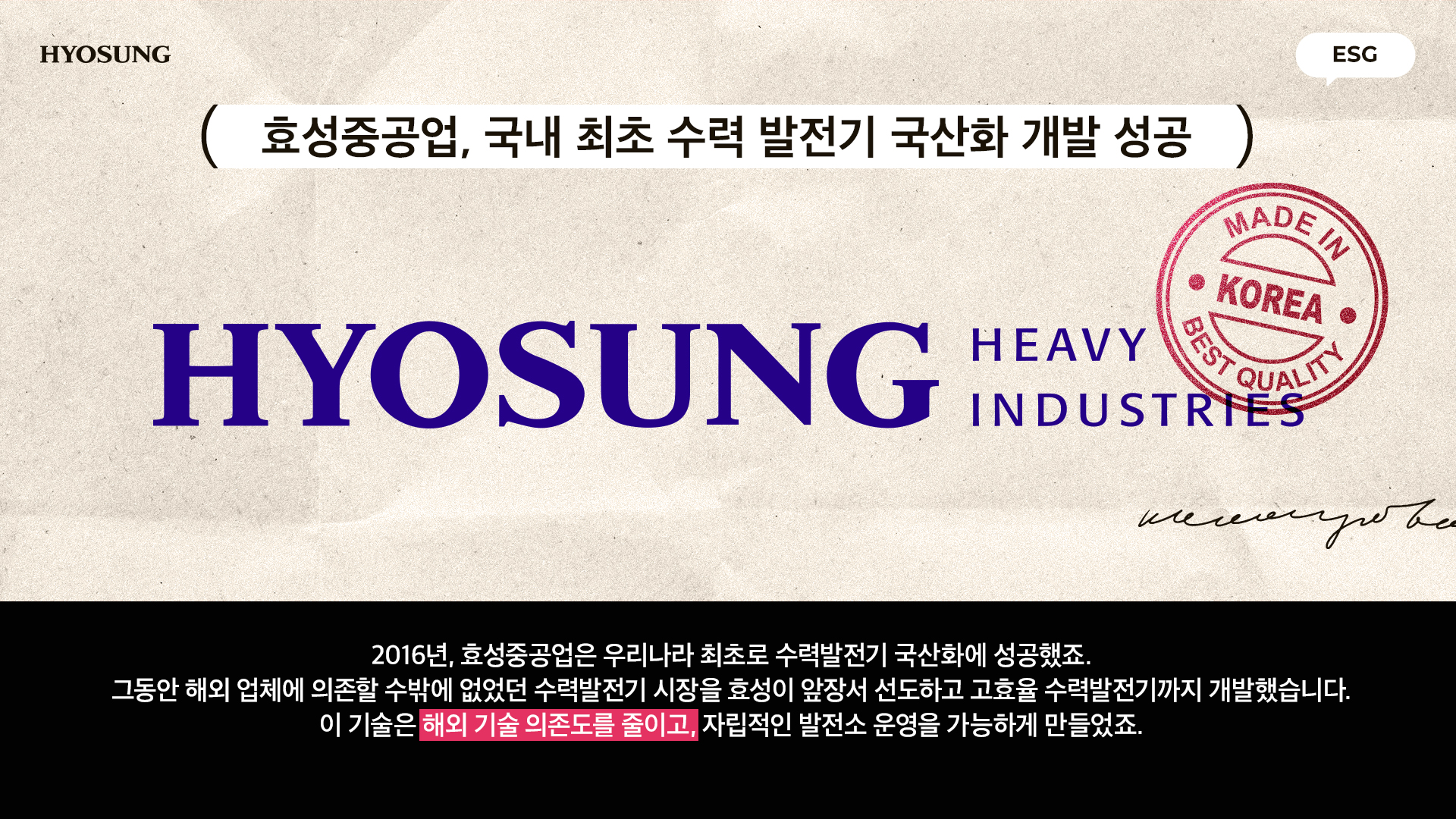 2016년, 효성중공업은 우리나라 최초로 수력발전기 국산화에 성공했죠. 그동안 해외 업체에 의존할 수밖에 없었던 수력발전기 시장을 효성이 앞장서 선도하고 고효율 수력발전기까지 개발했습니다. 이 기술은 해외 기술 의존도를 줄이고 자립적인 발전소 운영을 가능하게 만들었죠.