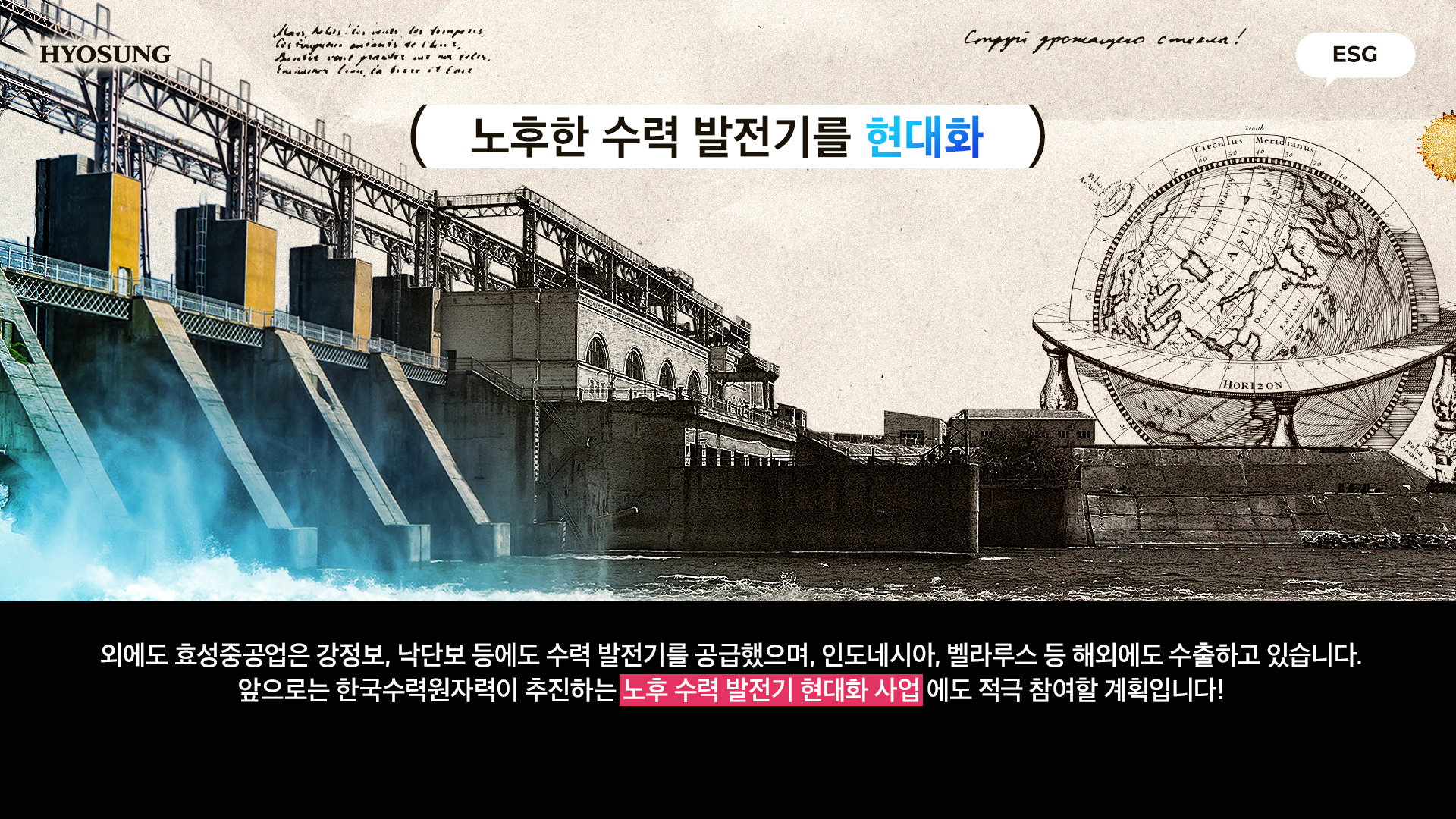 효성중공업은 강정보, 낙단보 등에도 소수력발전기를 공급했으며, 인도네시아, 벨라루스 등 해외에도 수출하고 있습니다. 앞으로는 한국수력원자력이 추진하는 노후 수력 발전기 현대화 사업에도 적극 참여할 계획입니다!