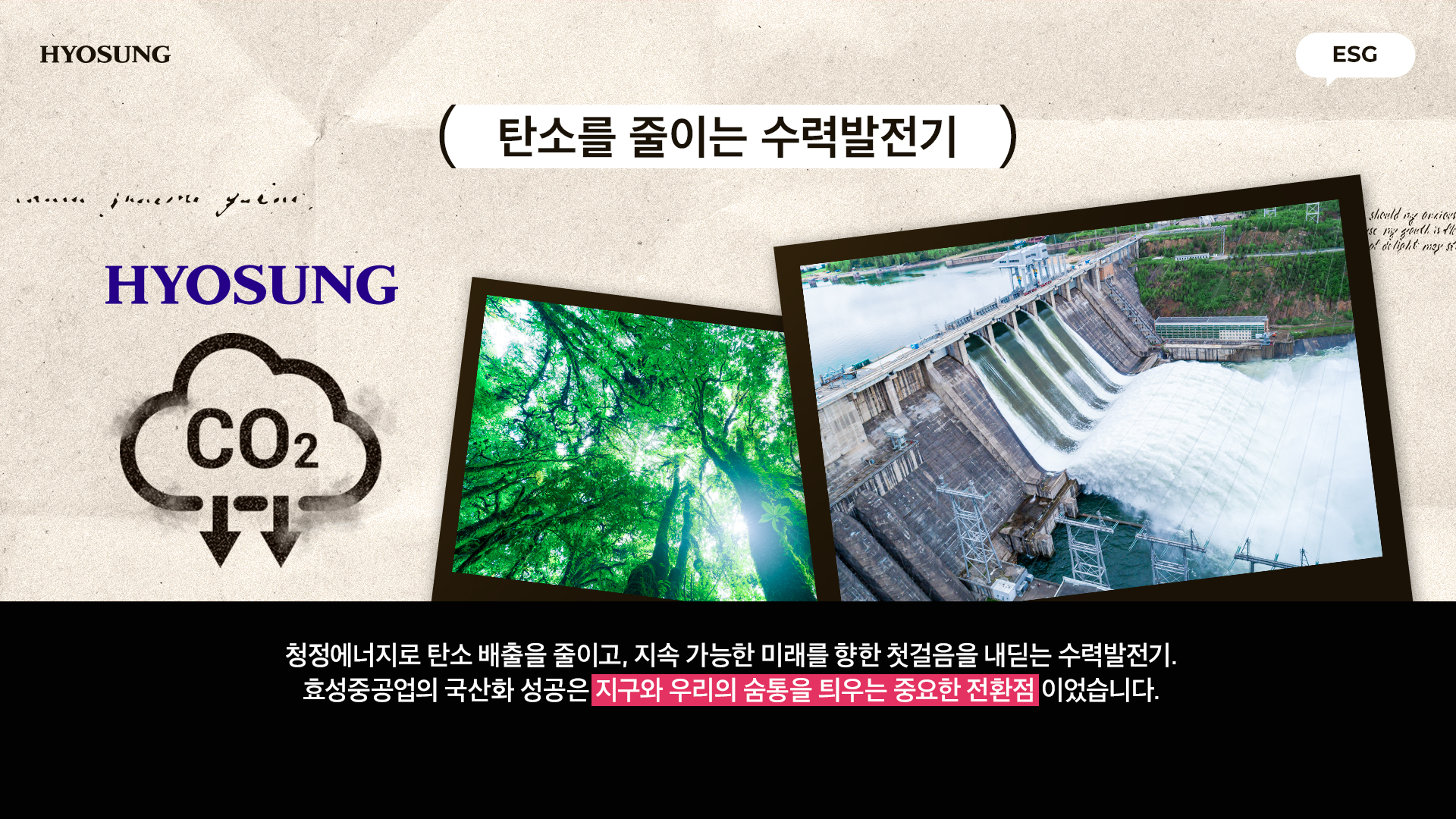 청정에너지로 탄소 배출을 줄이고 지속 가능한 미래를 향한 첫걸음을 내딛는 수력발전기. 효성중공업의 국산화 성공은 지구와 우리의 숨통을 틔우는 중요한 전환점이었습니다.