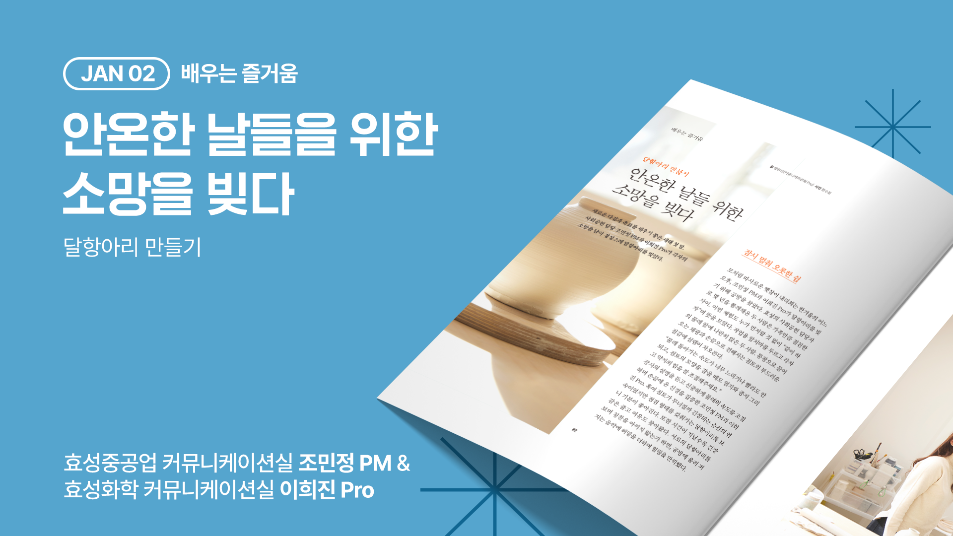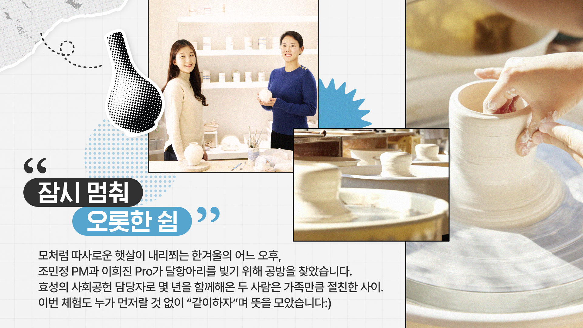 새로운 다짐과 목표를 세우기 좋은 새해 첫 달. 효성에서 사회공헌 활동을 담당하고 있는 조민정 PM과 이희진 Pro가 각자의 소망을 담아 정성스레 달항아리를 빚었는데요. 그 순간을 담아봤습니다.