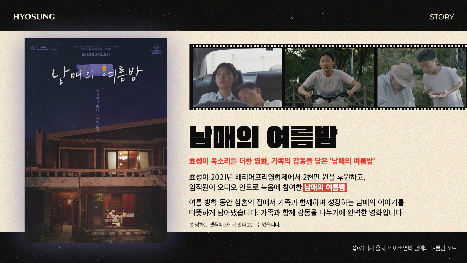 효성이 2021년 배리어프리영화제에서 2천만 원을 후원하고 임직원이 오디오 인트로 녹음에 참여한 '남매의 여름밤'