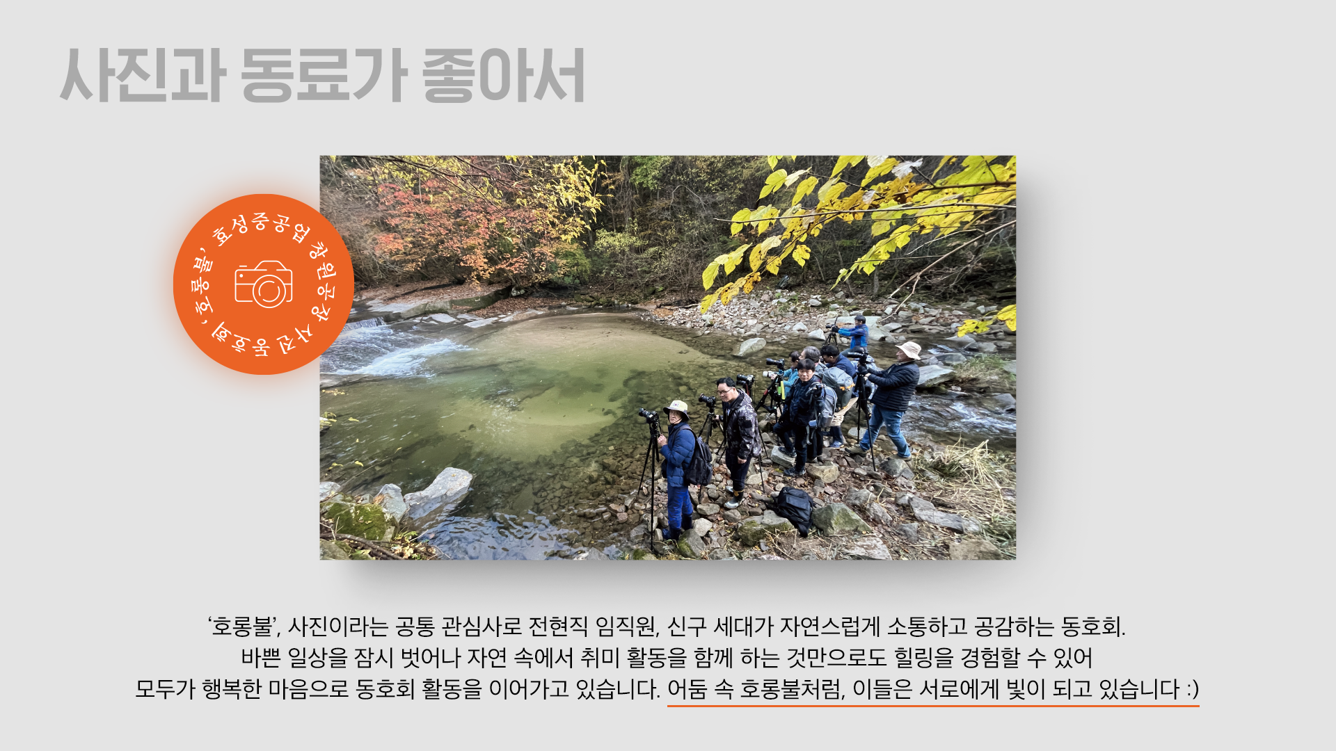 사진이라는 공통 관심사로 전현직 임직원, 신구 세대가 자연스럽게 소통하고 공감하는 동호회. 또 바쁜 일상을 잠시 벗어나 자연 속에서 취미 활동을 함께 하는 것만으로도 힐링을 경험할 수 있어 모두가 행복한 마음으로 동호회 활동을 이어가고 있는데요. 어둠 속 호롱불처럼, 이들은 서로에게 빛이 되고 있습니다.