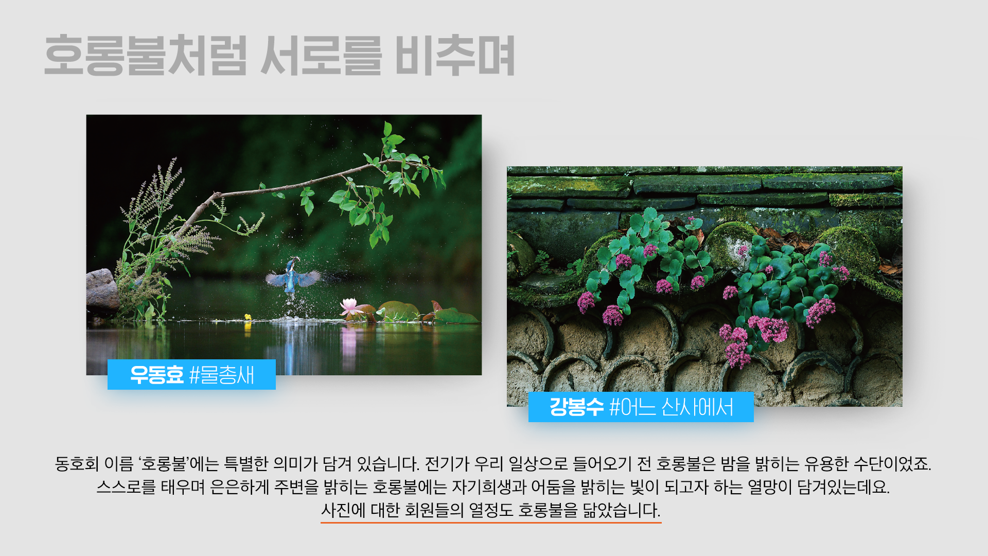 동호회 이름 ‘호롱불’에는 특별한 의미가 담겨 있는데요. 전기가 우리 일상으로 들어오기 전 호롱불은 밤을 밝히는 유용한 수단이었습니다. 스스로를 태우며 은은하게 주변을 밝히는 호롱불에는 자기희생과 어둠을 밝히는 빛이 되고자 하는 열망이 담겼습니다. 사진에 대한 회원들의 열정도 호롱불을 닮았습니다.