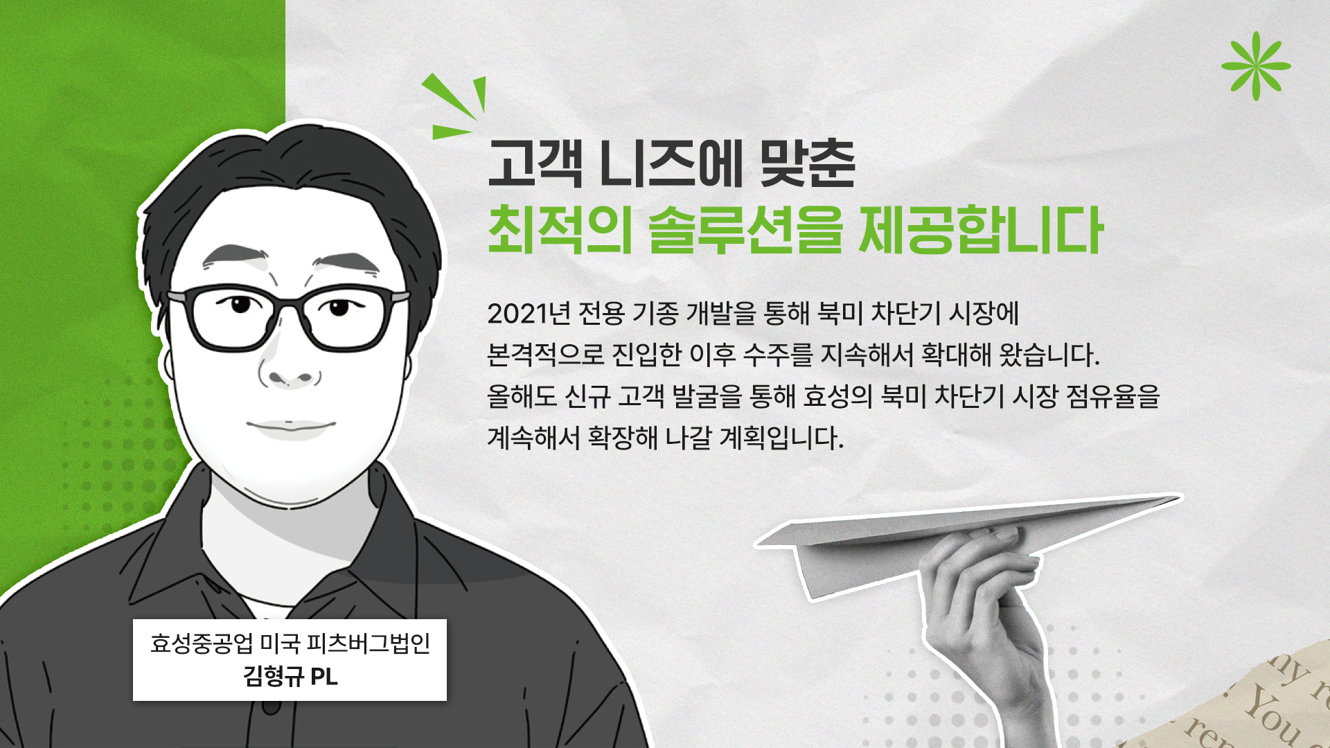 끊임없이 고객의 니즈를 이해하고, 미래를 위한 지속 가능한 솔루션을 제공하는 것이 바로 우리가 나아갈 길입니다. 김형규 PL과 김영주 PM은 각자의 분야에서 성과를 거두며, 고객과의 신뢰를 더욱 공고히 다져가고 있는데요. 앞으로도 효성은 고객과 함께 성장하는 파트너로서, 더 큰 성공을 향해 나아갈 것입니다:)