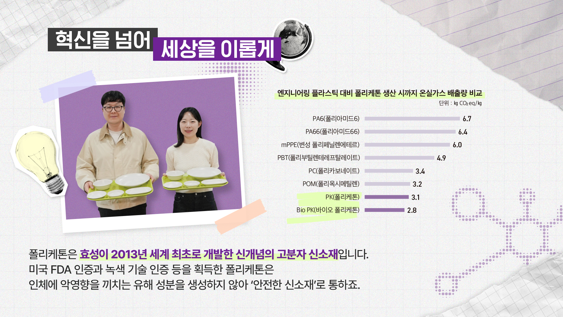폴리케톤은 효성이 2013년 세계 최초로 개발한 신개념의 고분자 신소재입니다. 미국 FDA 인증과 환경부 녹색 기술 인증 등을 획득한 폴리케톤은 인체에 악영향을 끼치는 유해 성분을 생성하지 않아 ‘안전한 신소재’로 통하죠. 폴리케톤은 일산화탄소와 올레핀(에필렌, 프로필렌)을 원료로 만드는데, 생산 시까지 발생하는 온실가스 배출량이 기존 엔지니어링 플라스틱의 절반 수준인데요. 이러한 까닭에 자동차, 식품용 컨베이어벨트, 화장품 용기 부품, 정수기 등 내구성이 뛰어나면서도 유해 성분이 없는 플라스틱 소재를 필요로 하는 각종 산업에서 사용 영역이 점차 확대되는 추세입니다.