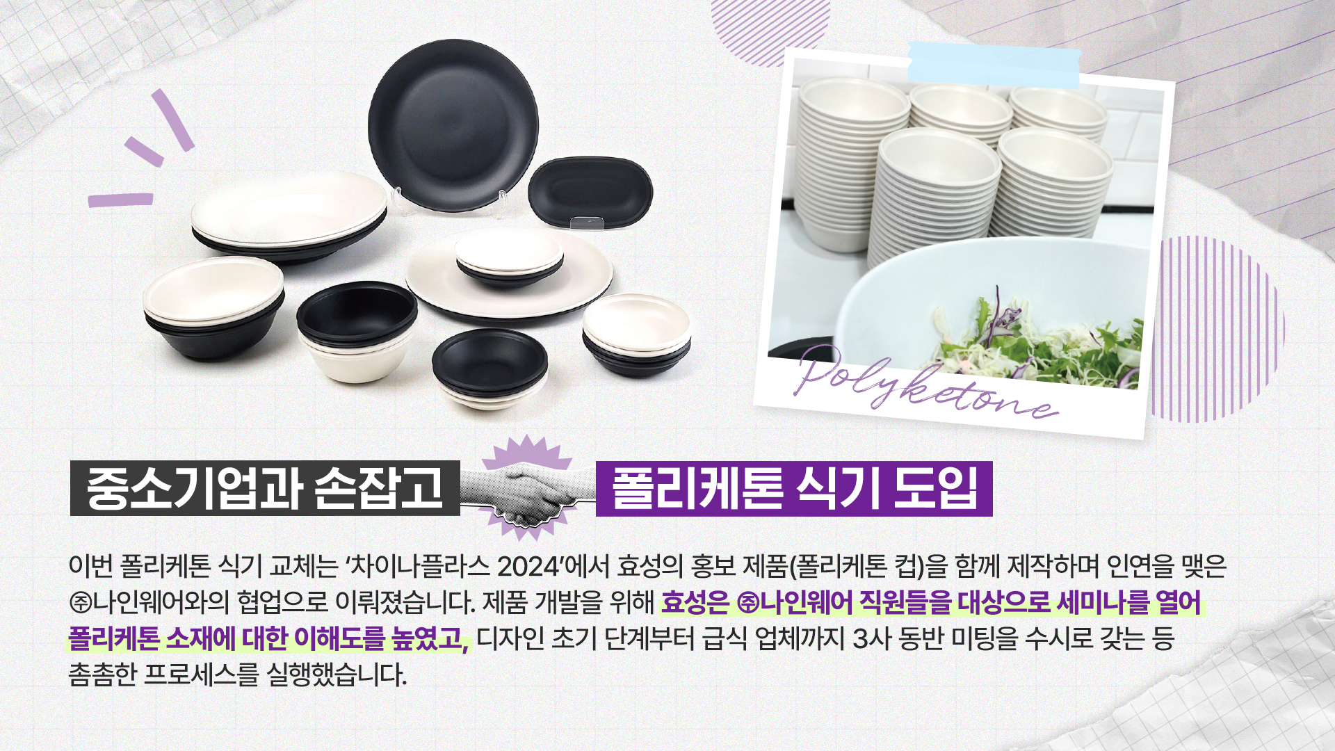 때로는 작은 행동이 큰 변화를 이끌어내죠. 효성은 폴리케톤 식기 도입을 계기로 환경 문제의 중요성을 다시금 인지하고, 계속해서 지속 가능한 변화를 이끌어 낼 계획입니다:)
