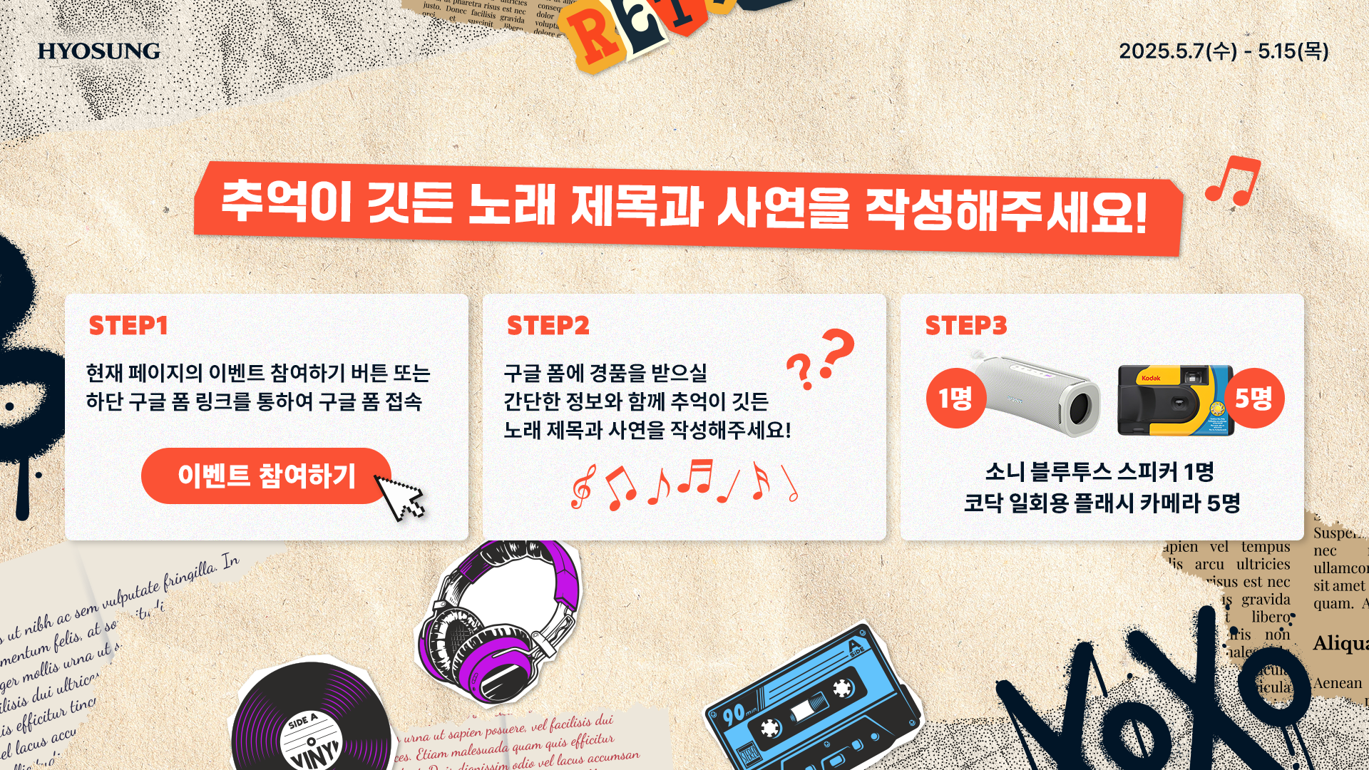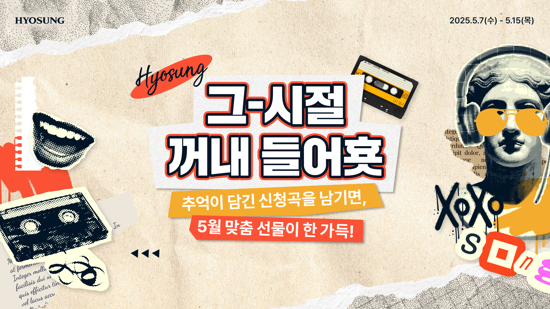 추억 속으로 데려가는 마법 같은 힘을 가진 여러분만의 음악이 있다면 '그-시절 꺼내 들어횻'에 곡에 담긴 사연과 함께 남겨주세요! 효성 DJ랑 함께 기억을 공유하며 따뜻한 5월 분위기를 만끽하고, 특별한 선물도 받아 가세요!