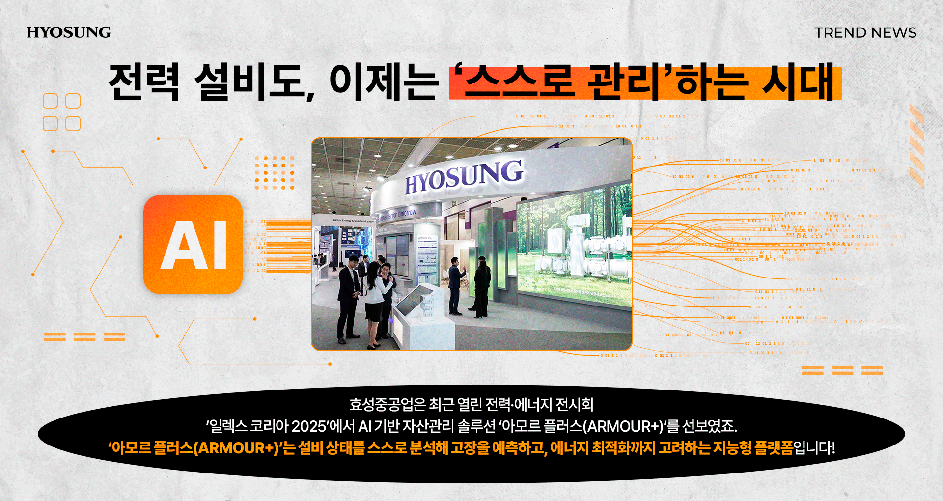 효성중공업은 최근 열린 전력·에너지 박람회 ‘일렉스 코리아 2025’에서 AI 기반 전력 설비 자산관리 솔루션 ‘아모르 플러스(ARMOUR+)’를 선보였습니다.