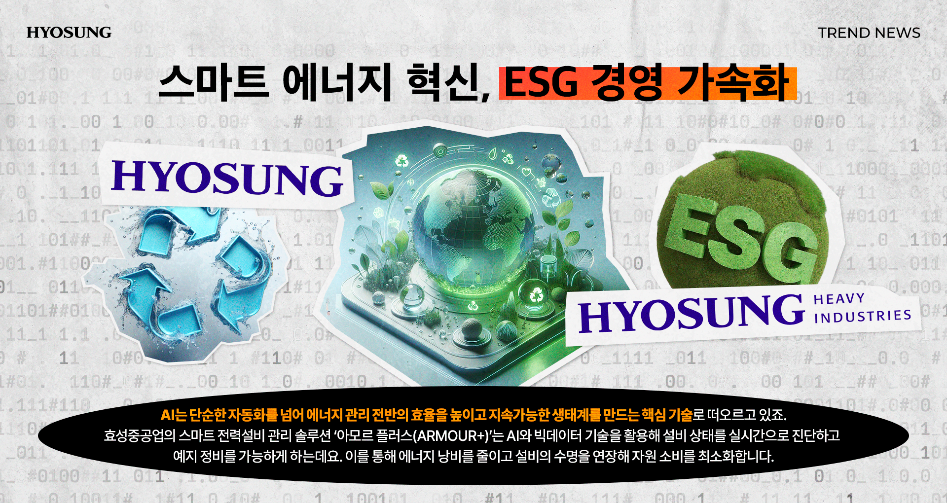 효성중공업의 스마트 전력설비 관리 솔루션 ‘아모르 플러스(ARMOUR+)’는 AI와 빅데이터 기술을 활용해 설비 상태를 실시간으로 진단하고 예지 정비를 가능하게 하는데요. 이를 통해 에너지 낭비를 줄이고 설비의 수명을 연장해 자원 소비를 최소화합니다. 예기치 못한 사고를 예방해 산업 안전에도 기여하죠.