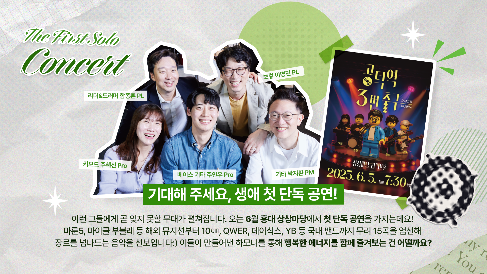 이런 그들에게 곧 잊지 못할 무대가 펼쳐집니다! 오는 6월 홍대 상상마당에서 첫 단독 공연을 가지는 것인데요. 마룬5, 마이클 부블레 등 해외 뮤지션부터 10㎝, QWER, 데이식스, YB 등 국내 밴드까지 무려 15곡을 엄선해 장르를 넘나드는 음악을 선보입니다. 지난 4월에는 예행연습을 치르기도 했죠.