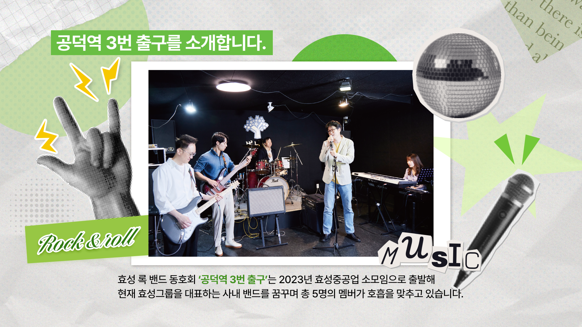 효성 록 밴드 동호회 ‘공덕역 3번 출구’는 2023년 효성중공업 소모임으로 출발해 현재 효성그룹을 대표하는 사내 밴드를 꿈꾸며 총 5명의 멤버가 호흡을 맞추고 있습니다. 처음에는 효성중공업 전력PU의 대표 아이템에서 따온 ‘변압기와 차단기’란 이름으로 활동했으나 이후 효성티앤씨 구성원이 합류하면서 밴드는 새로운 전환점을 맞이했고, 효성중공업을 넘어 회사를 대표하는 밴드 동호회로 성장하고픈 포부를 담아 효성그룹 본사가 위치한 공덕역 3번 출구를 밴드명으로 변경했죠. 음악이라는 공통 언어로 스트레스를 푸는 이들은 서로의 음악적 취향을 존중하며 1~2주에 한 번씩 만나 연습에 매진합니다.