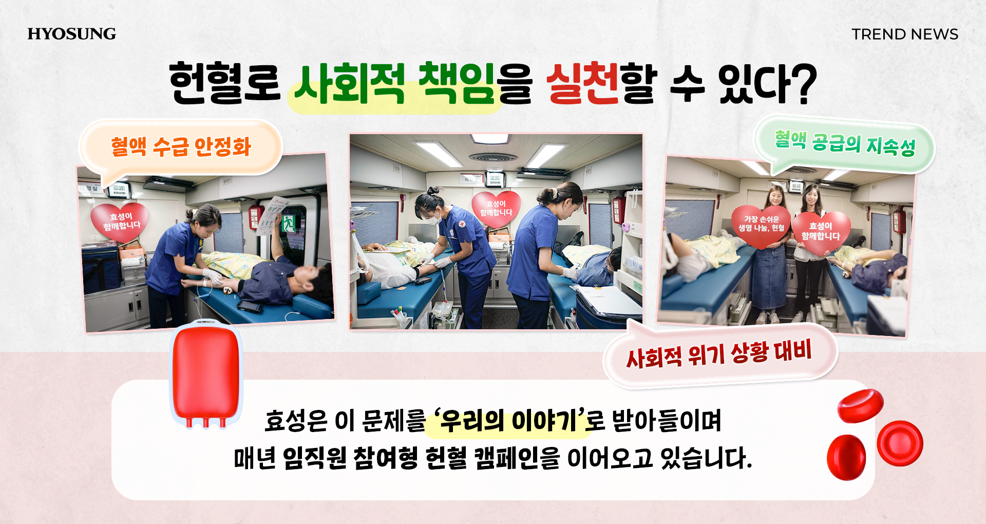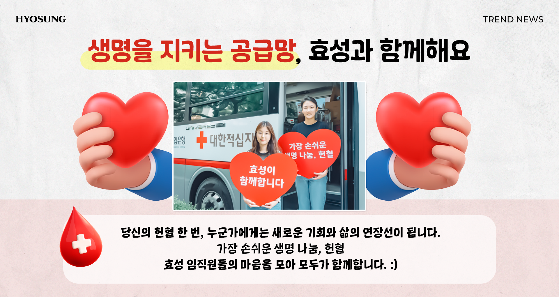 효성은 ESG 경영의 일환으로 헌혈 캠페인에 지속적으로 참여하며, 임직원들과 함께 생명을 지키는 연결망을 만들어가고 있습니다. 앞으로도 효성은 따뜻한 실천으로 사회적 가치를 확산하는 데 앞장서겠습니다.