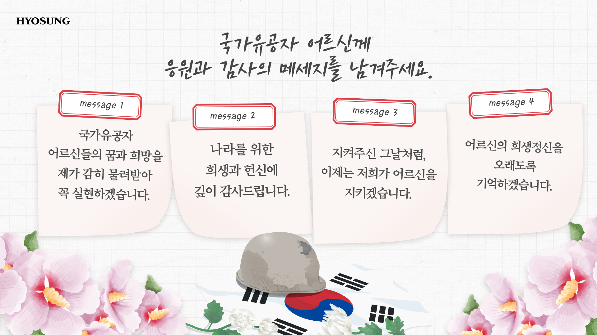 6월, 보훈의 달을 맞아 효성이 국가유공자 어르신께 감사와 존경을 전하며 여러분과 함께 따뜻한 마음을 모은 감사 이벤트가 성황리에 마무리되었습니다.