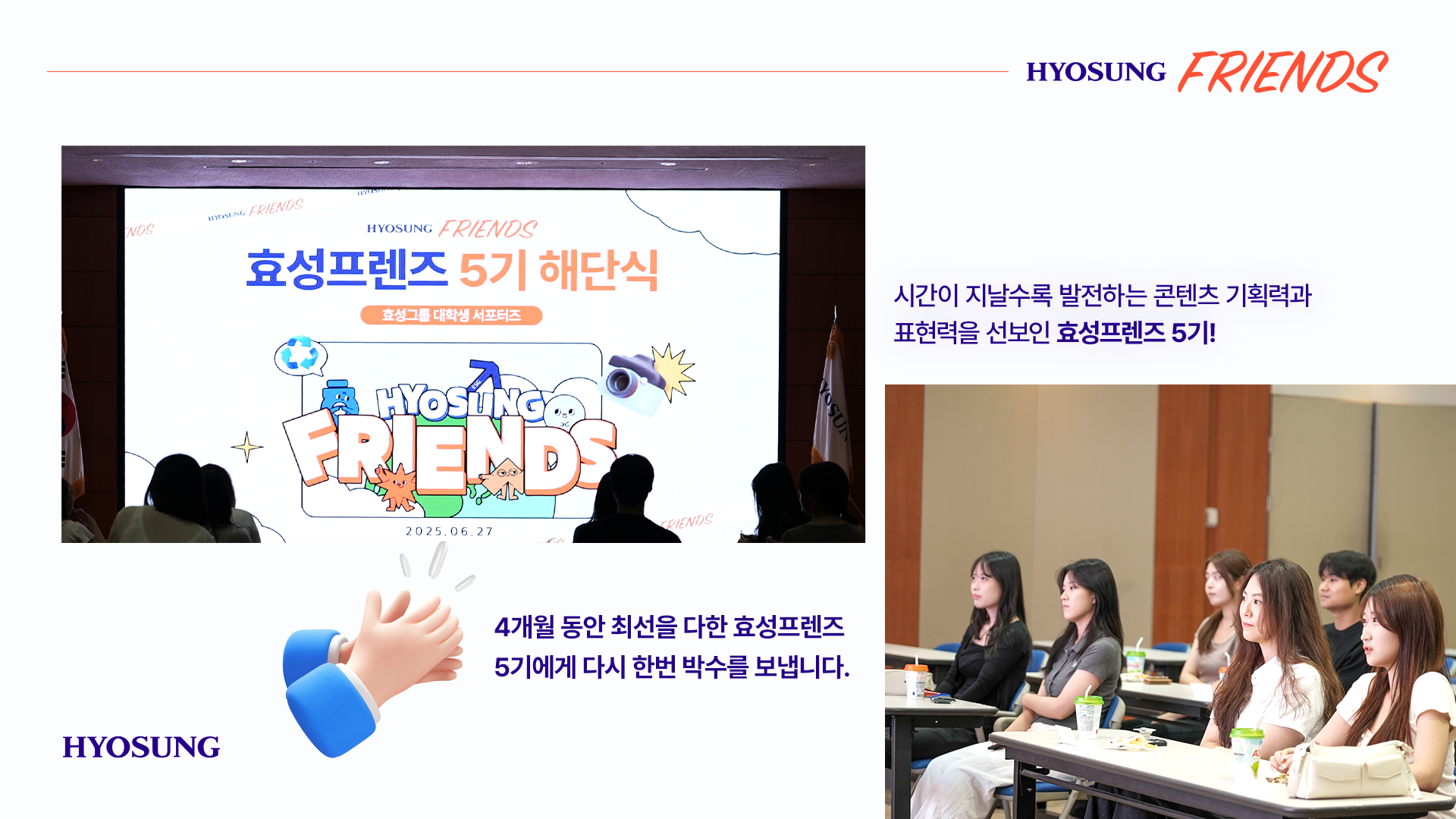 학업과 병행하며 쉽지 않은 일정 속에서도 끝까지 최선을 다한 효성프렌즈 5기에게 다시 한번 박수를 보냅니다👏