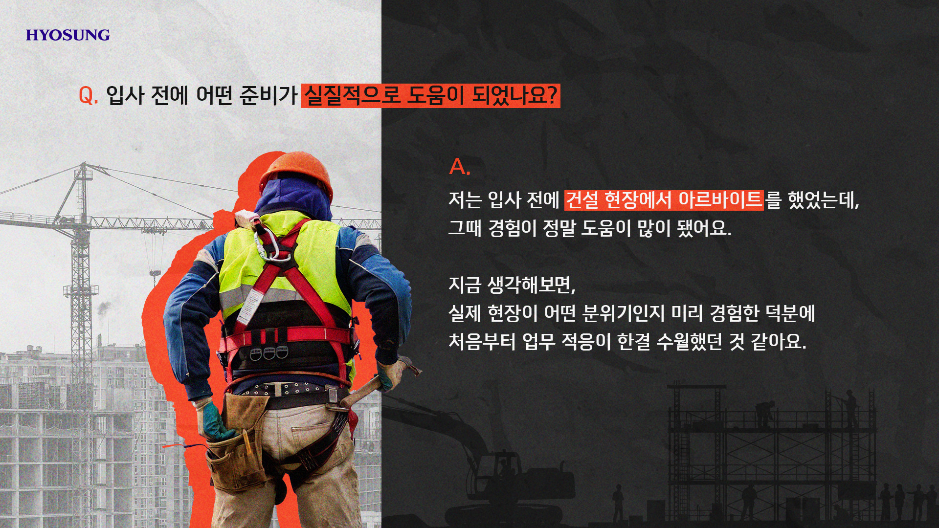 저는 입사 전에 건설 현장에서 아르바이트를 했었는데, 그때 경험이 정말 도움이 많이 됐어요.