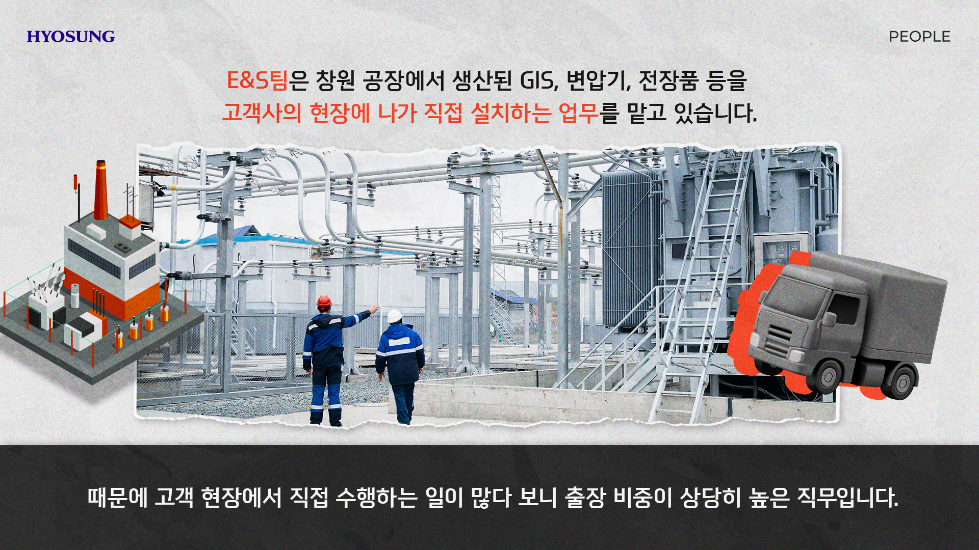 E&S팀은 창원 공장에서 생산된 GIS, 변압기, 전장품 등을 고객사의 현장에 나가 직접 설치하는 업무를 맡고 있습니다. 예를 들어 고객이 삼성전자라면, 삼성전자 공장 현장에 저희 제품을 설치하는 거죠.