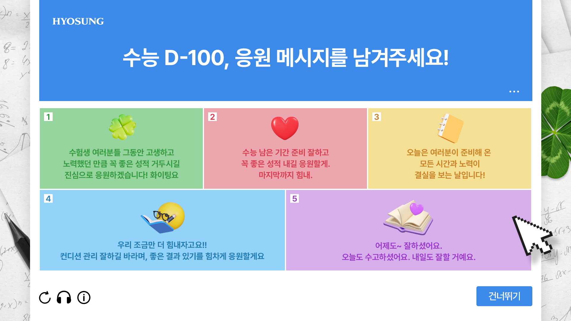 효성과 함께하는 수능 D-100 응원 메시지 이벤트에 참여해 주신 모든 분께 감사드립니다! ☀️ 얼마남지 않은 수능! 많은 분들의 응원 속에서 수험생들이 좋은 에너지를 얻었습니다:)