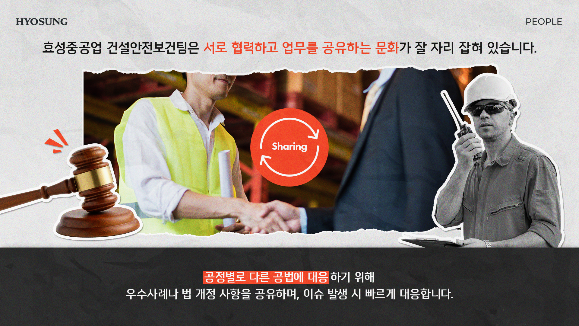 서로 협력하고 업무를 공유하는 문화가 잘 자리 잡혀 있습니다. 공정별로 다른 공법에 대응하기 위해 우수사례나 법 개정 사항을 공유하며, 이슈 발생 시 빠르게 대응합니다.