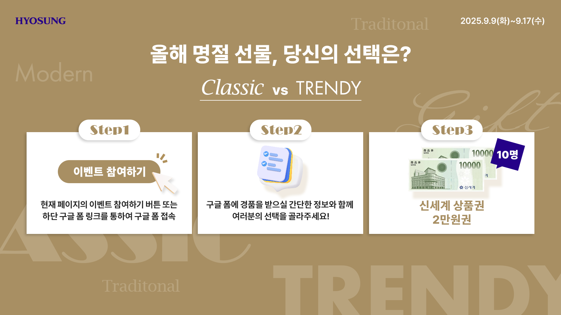 | [이벤트 당첨자] <올해 명절 선물, 당신의 선택은?> Classic vs Trendy (0) | 2025.09.23 |