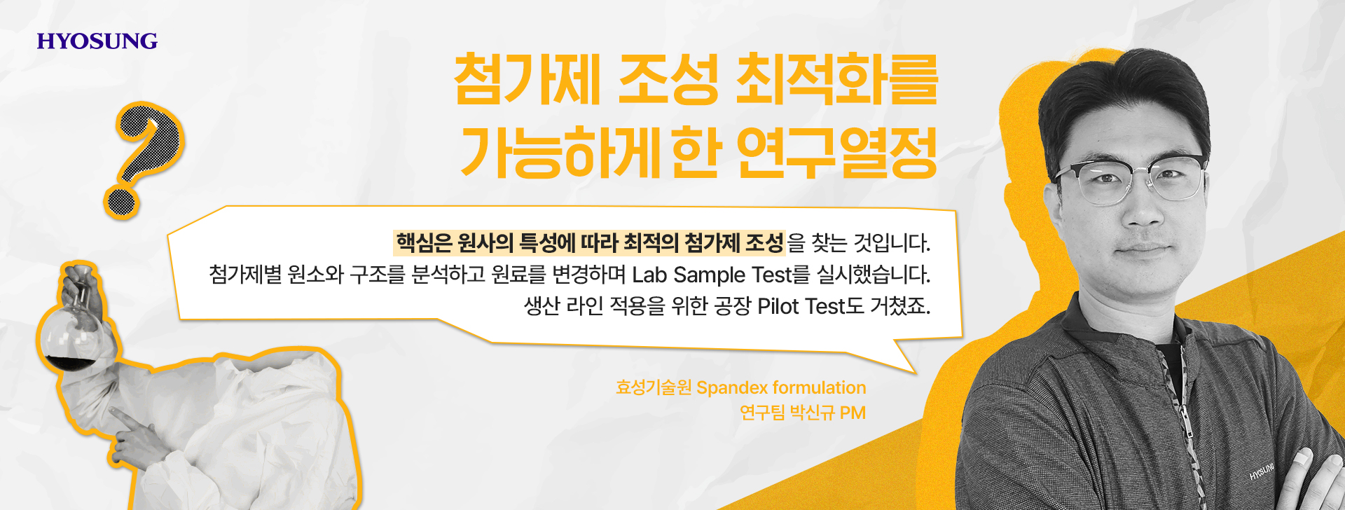 박신규 PM은 스판덱스 첨가제 연구 총괄로서 첨가제 조성의 최적화를 고민하며 첨가제 기술 개발에 앞장섰습니다.