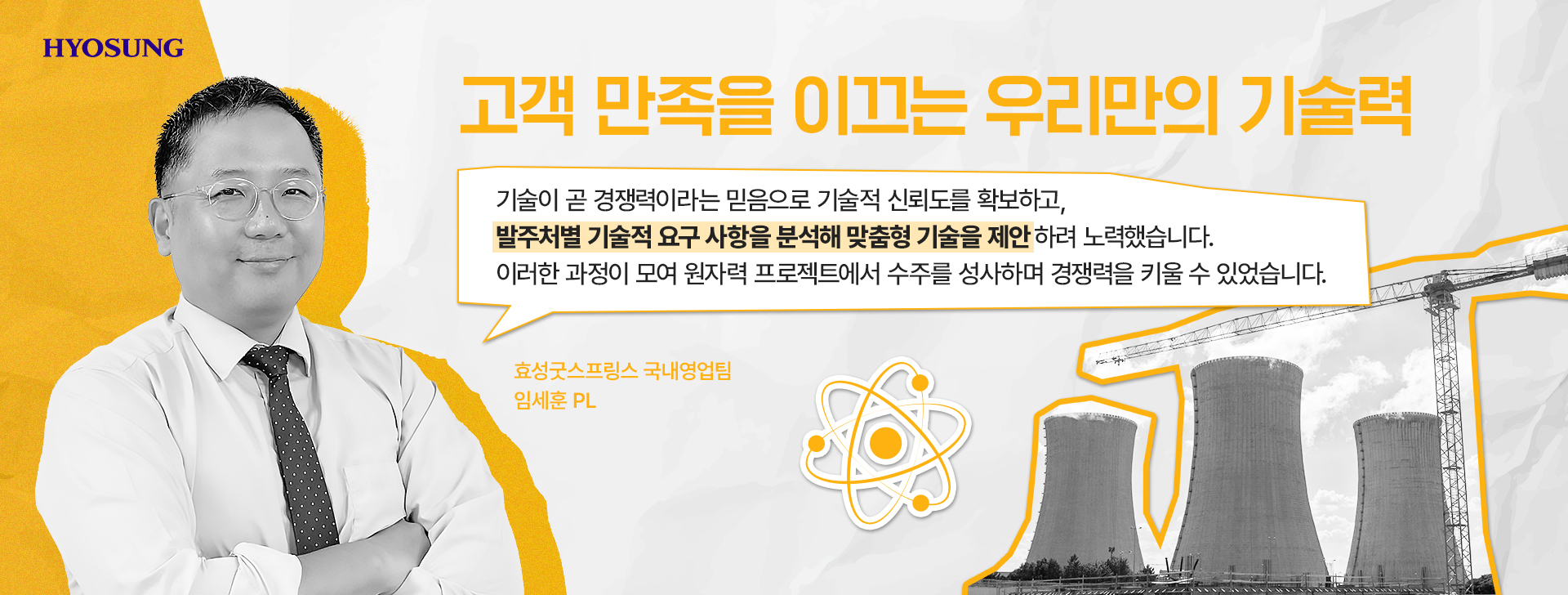 임세훈 PL은 고객의 우려를 해소하기 위해 원가 절감안을 제시함은 물론, 사내 펌프시험센터에서 진동 품질 기준을 입증할 수 있다는 사실을 강조하며 효성의 독보적인 기술력을 증명했습니다. 이 외에도 국내 유일의 RCP(원자로 냉각재 펌프) 국산화 실적을 보유한 기술력을 통해 다목적 소형 모듈 원전 수주뿐 만 아니라 안전 등급 펌프 등 다양한 기종을 수주하며 실적을 쌓아갔습니다.