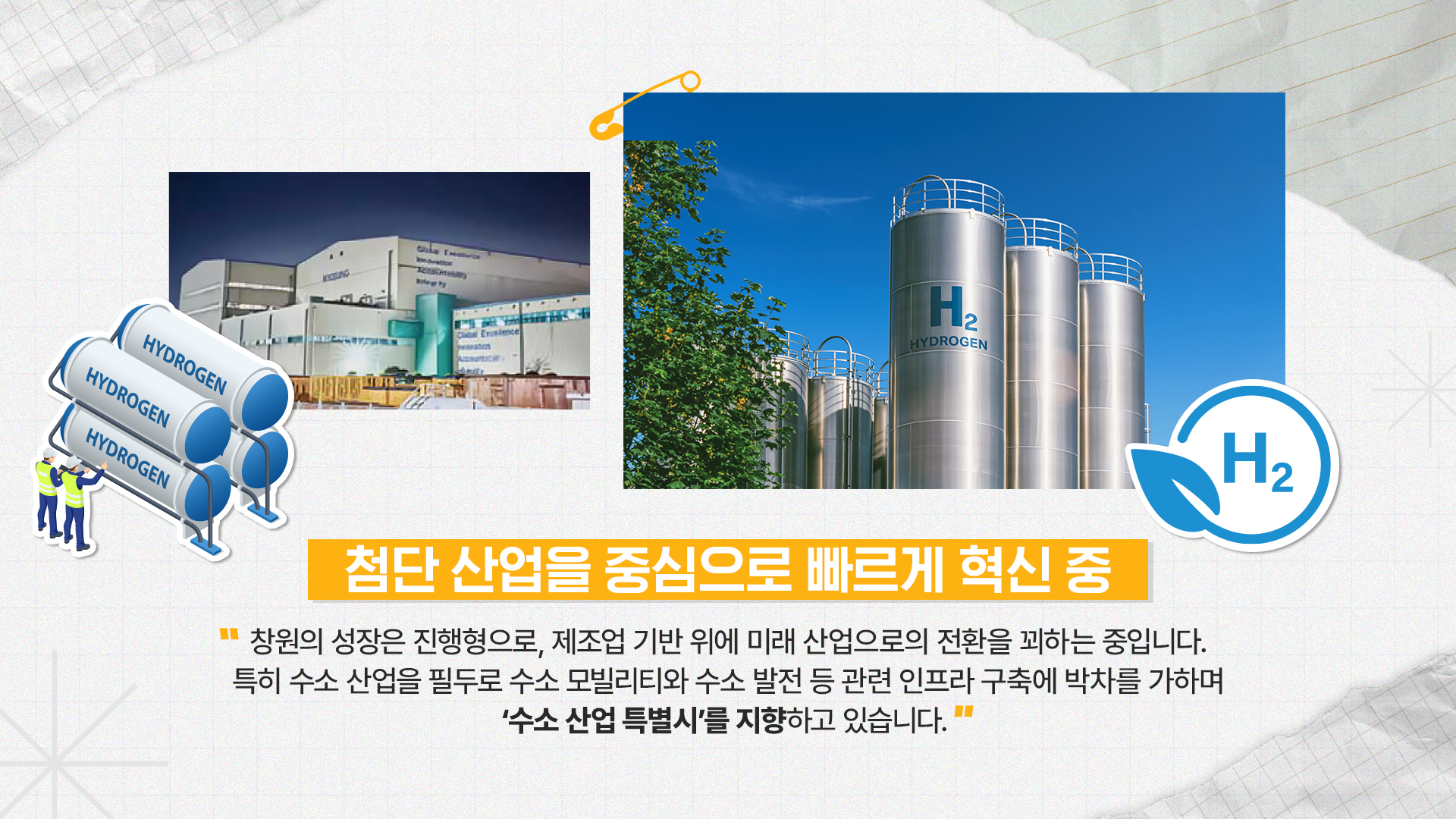 창원의 성장은 진행형으로, 제조업 기반 위에 미래 산업으로의 전환을 꾀하는 중입니다. 특히 수소 산업을 필두로 수소 모빌리티와 수소 발전 등 관련 인프라 구축에 박차를 가하며 ‘수소 산업 특별시’를 지향하고 있습니다. 이 외에도 방위 산업 클러스터 조성, 항공 우주 및 로봇 산업 육성 등 고부가가치 산업 중심의 전략을 추진하고 있으며 이를 뒷받침하는 연구 개발과 산학 협력도 활발히 진행 중입니다.