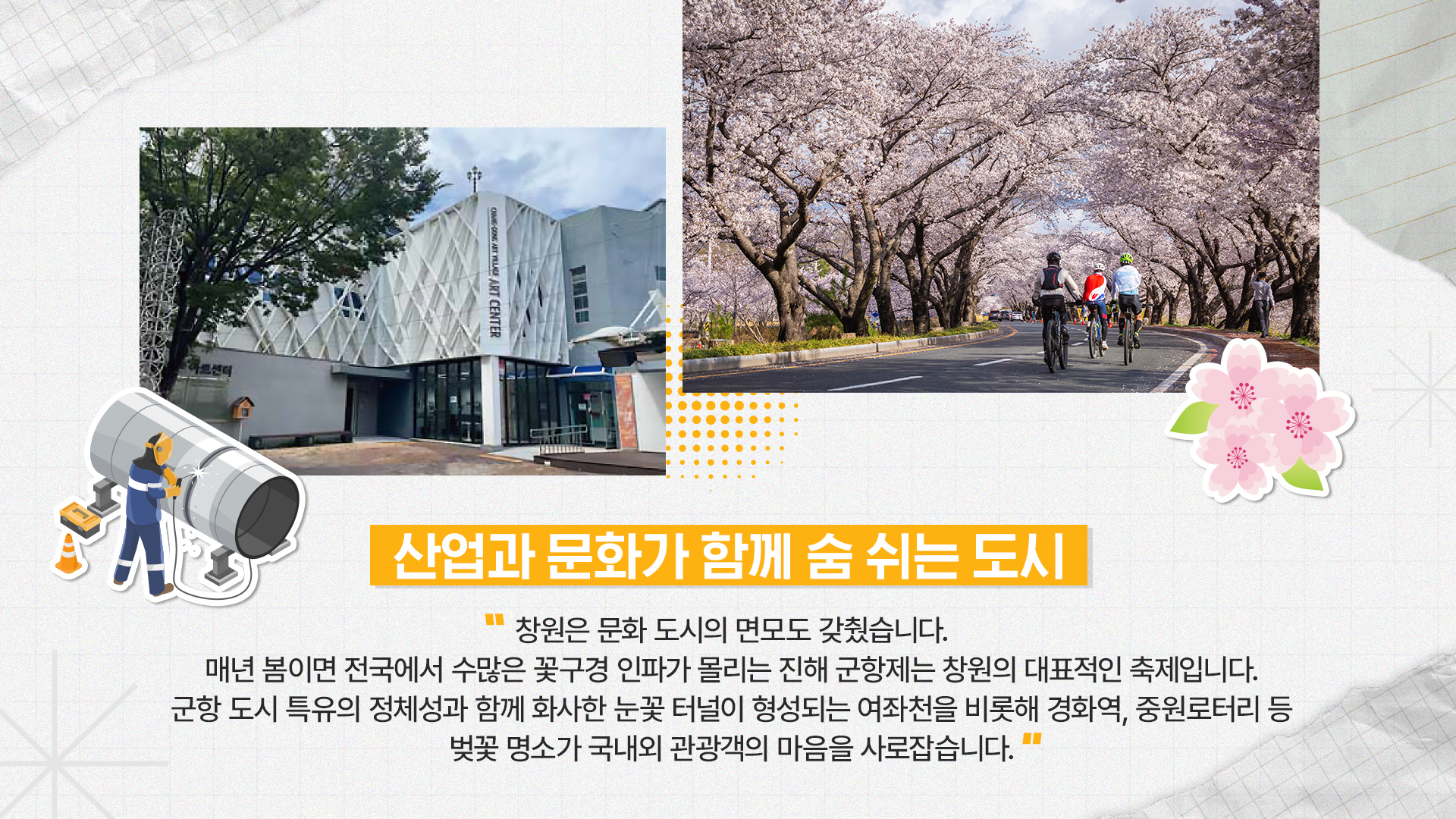 창원은 문화 도시의 면모도 갖췄습니다. 매년 봄이면 전국에서 수많은 꽃구경 인파가 몰리는 진해 군항제는 창원의 대표적인 축제입니다. 군항 도시 특유의 정체성과 함께 화사한 눈꽃 터널이 형성되는 여좌천을 비롯해 경화역, 중원로터리 등 벚꽃 명소가 국내외 관광객의 마음을 사로잡습니다.
