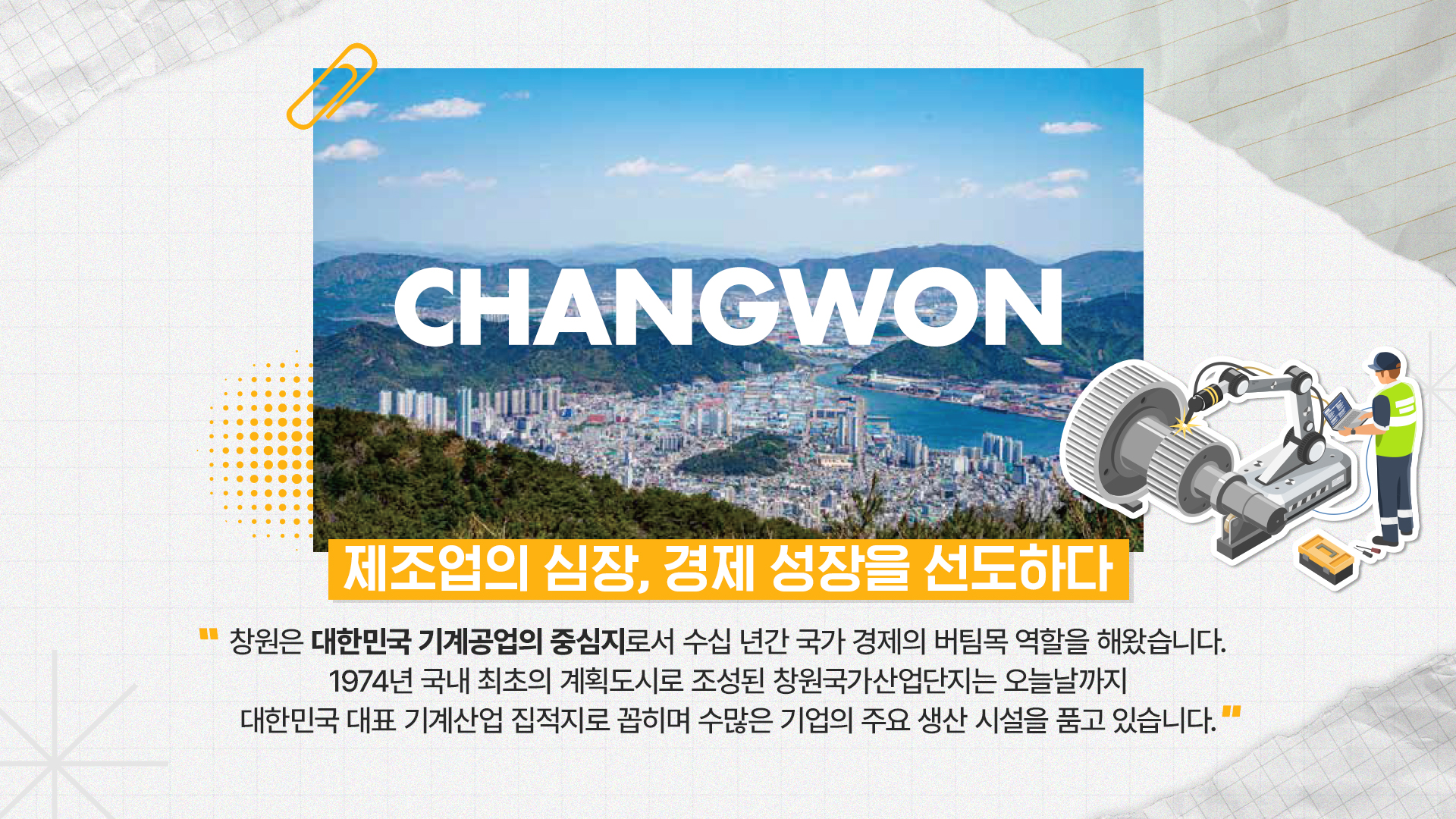 창원은 대한민국 기계공업의 중심지로서 수십 년간 국가 경제의 버팀목 역할을 해왔습니다. 1974년 국내 최초의 계획도시로 조성된 창원국가산업단지는 오늘날까지 대한민국 대표 기계산업 집적지로 꼽히며 수많은 기업의 주요 생산 시설을 품고 있습니다.
