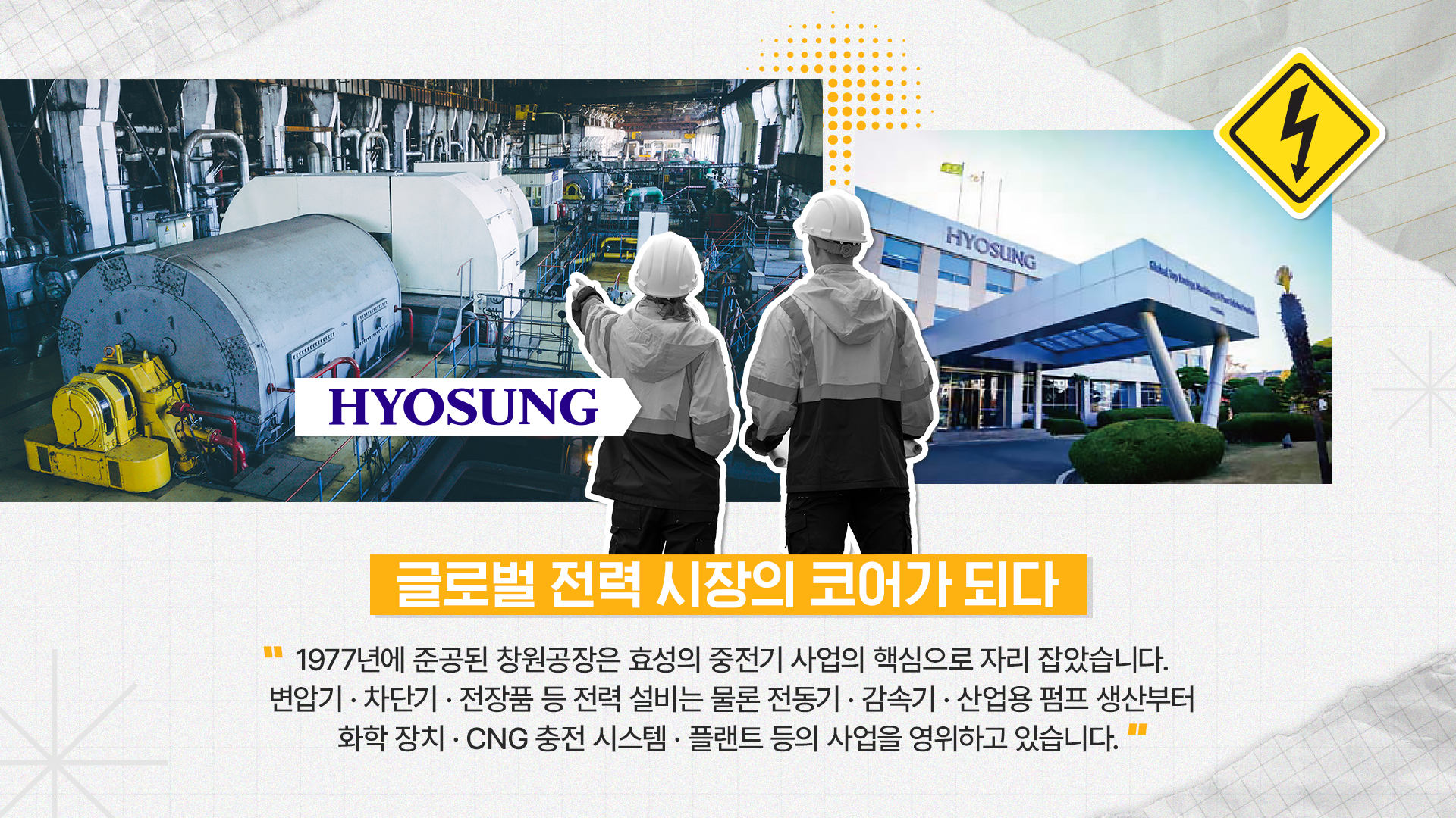 1977년에 준공된 창원공장은 효성의 중전기 사업의 핵심으로 자리 잡았습니다. 변압기·차단기·전장품 등 전력 설비는 물론 전동기·감속기·산업용 펌프 생산부터 화학 장치·CNG 충전 시스템·플랜트 등의 사업을 영위하고 있습니다. 신성장 동력 육성에도 힘쓰고 있는 창원공장은 2024년 초고압 변압기 공장을 증설해 생산 능력을 40% 더 늘린다는 목표를 밝혔습니다.