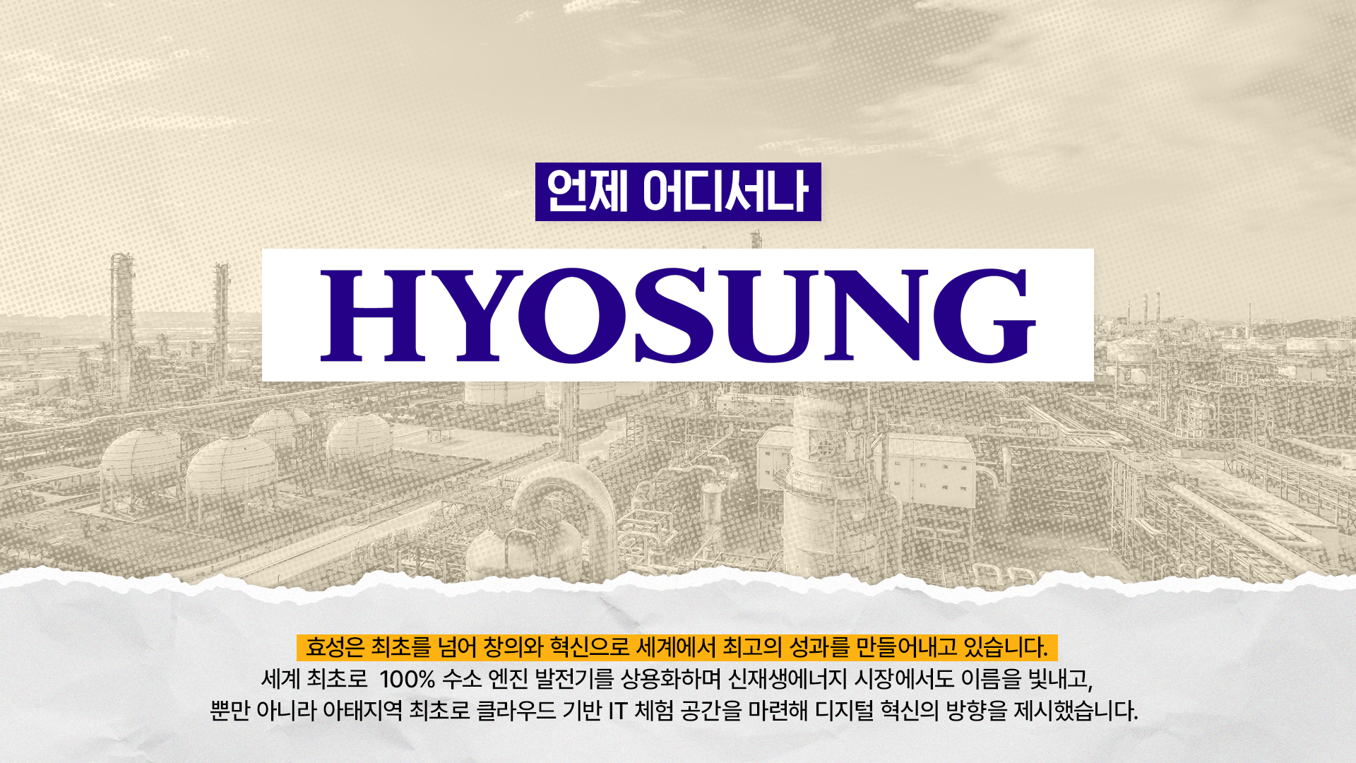 끊임없는 도전과 혁신으로 ‘최초’를 만들어온 효성은 앞으로도 기술력과 창의성을 바탕으로 세계와 함께 성장할 것입니다. 일상의 작은 순간부터 미래 산업의 큰 변화를 이끌며, 고객과 사회에 더 큰 가치를 전하는 든든한 파트너로 자리하겠습니다.