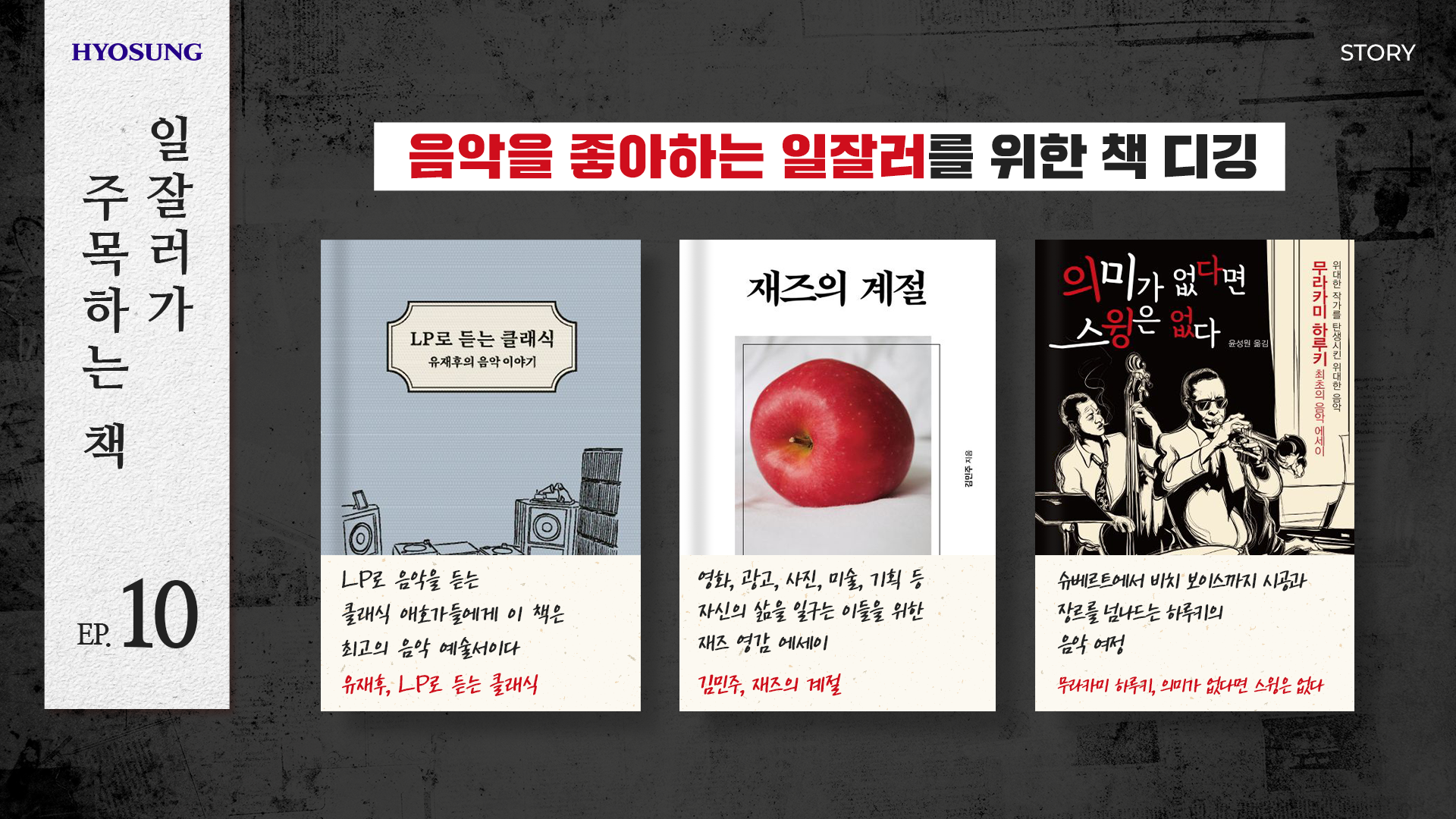 일잘러에게 음악은 단순한 취향을 넘어 삶과 일을 연결하는 리듬이 됩니다. 클래식, 재즈, 스윙 각기 다른 장르지만 공통적으로 ‘일하는 나’를 흔들어 깨우고 다시 앞으로 나아가게 합니다. 이번 주에는 책장을 통해 음악을 ‘듣는 독서’의 시간을 보내보는 건 어떨까요?
